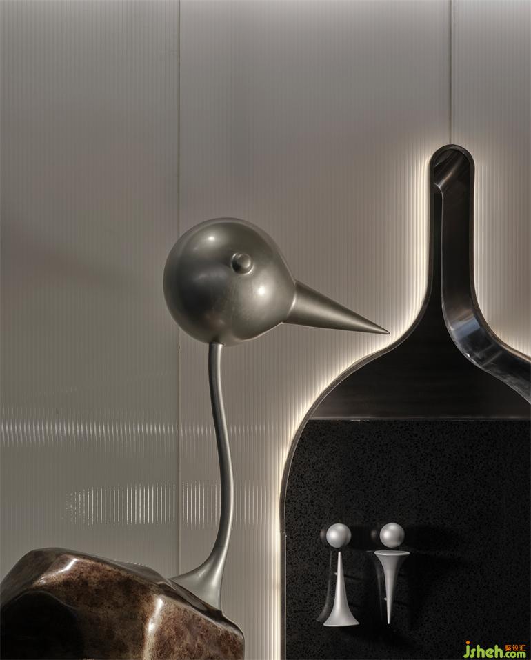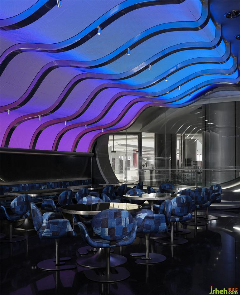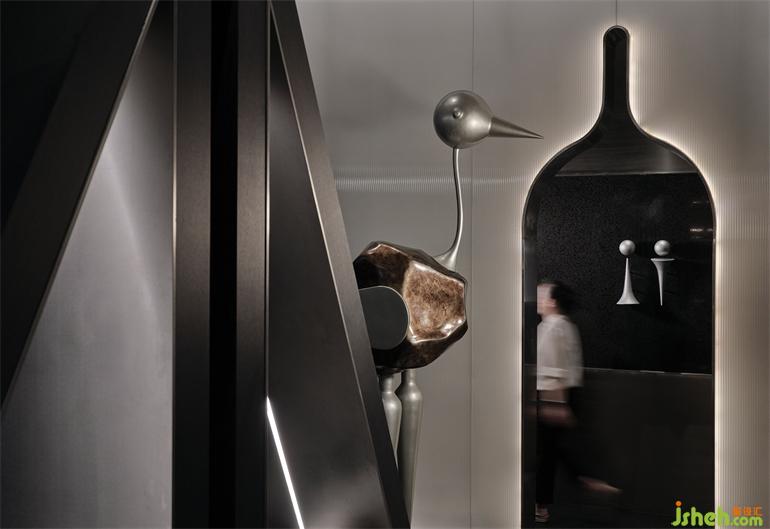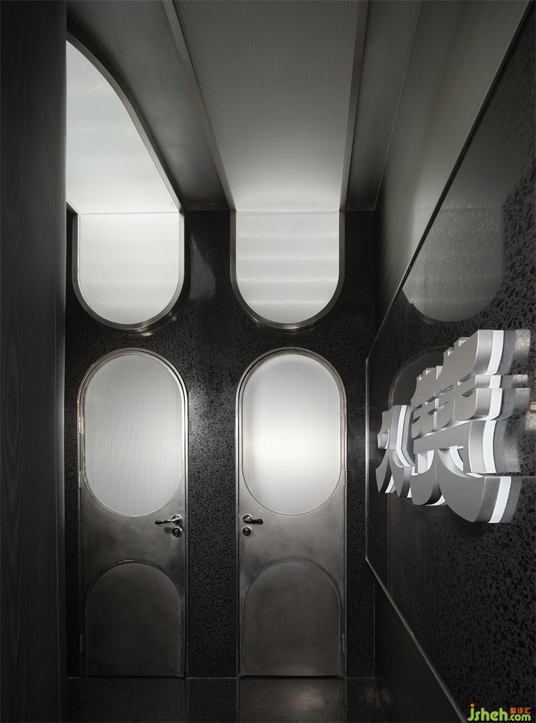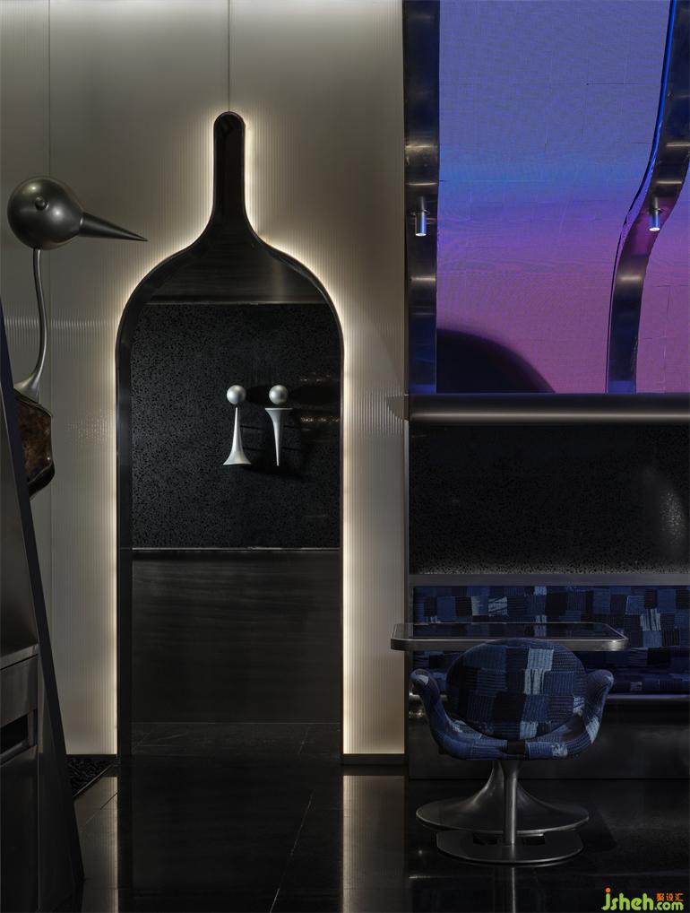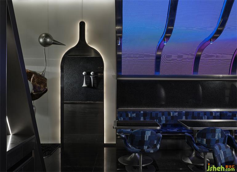 成都居酒屋設(shè)計強烈工業(yè)感的金屬結(jié)構(gòu)貫穿于空間內(nèi)部,非鏡面的實體反射穿插實體曲面的虛擬景象,結(jié)合微妙光影構(gòu)筑商業(yè)藝術(shù)化的場景體驗。蛋殼形態(tài)的座椅在意象化的大環(huán)境中注入感性的單純,塑造包裹性的舒適空間感受。三角形的鋼架結(jié)構(gòu)模擬飛翔的羽翼,裂縫般的墻體裝置寓意撕裂現(xiàn)實的生命張力。成都居酒屋設(shè)計賦形于卡座椅面和背景墻的藍色布藝,則為賽博朋克式的數(shù)字社交語境注入局部寫實的手工拼接感,現(xiàn)代與過去的交疊激發(fā)深度情緒體驗的氛圍營造。