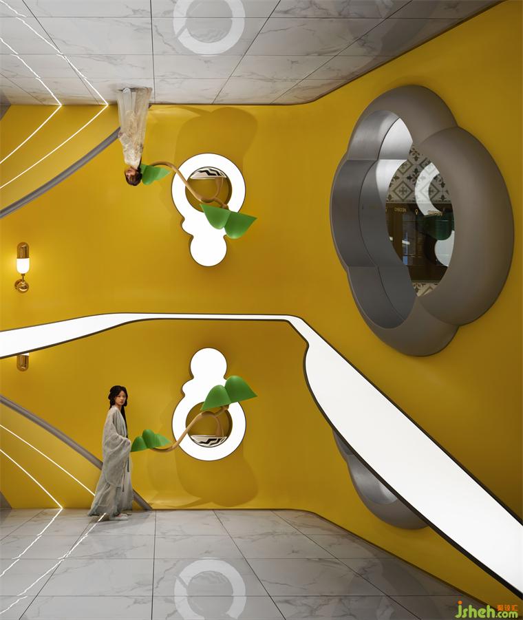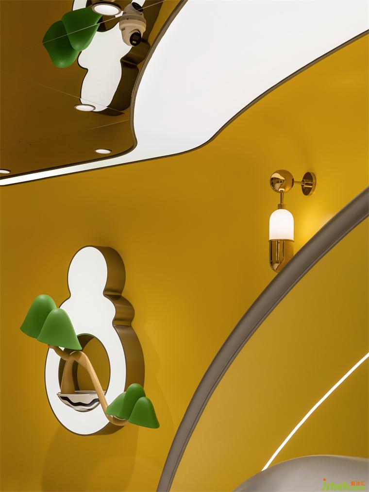 兒童樂園設(shè)計流線型的前臺仿若寫意勾繪的山水亭臺,亦是傳統(tǒng)文化與時代要素對接的“時空樞紐站”。墻面“奶嘴”Logo植入盆景意象的戶牗雕飾,以煥新的細(xì)節(jié)符號預(yù)示一場超脫現(xiàn)實的夢境之旅。