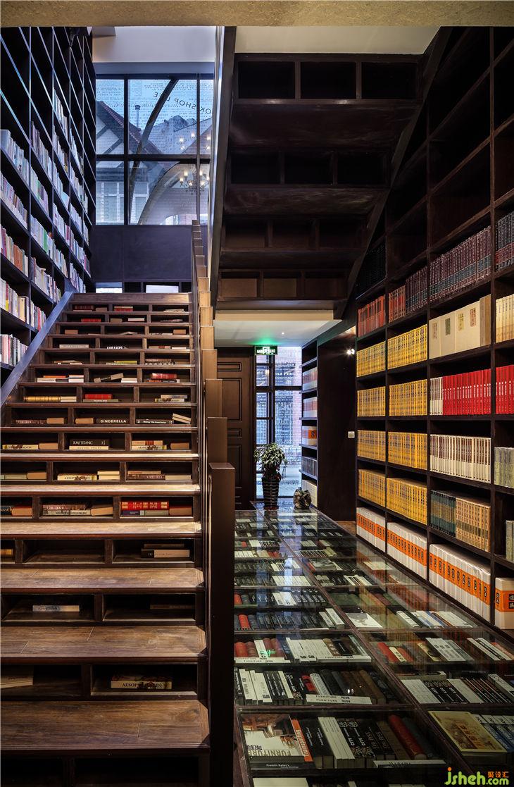 聯(lián)系上下兩層的樓梯間被徹底改造,它成為書店的正入口,是門廳,更是殿堂。那從那個(gè)簡(jiǎn)約教堂吊頂灑落的日光,禮贊的是書籍和它們背后凝聚的智慧。書籍不僅成列在兩廂,更鋪就在地上,地面是書架,樓梯前后也可以放書,乍看,這里是被推倒的矜持的書架,都好像蠻適合愛低頭走路的讀者,但設(shè)計(jì)師不僅僅為了這;因?yàn)樵谶@里你必須輕輕地踩在上面,不自覺地表現(xiàn)出對(duì)書籍的敬意。事實(shí)上,設(shè)計(jì)師只是塑造想被緊緊擁抱的感覺,有時(shí)是書,有時(shí)是人!