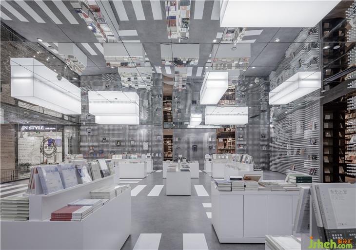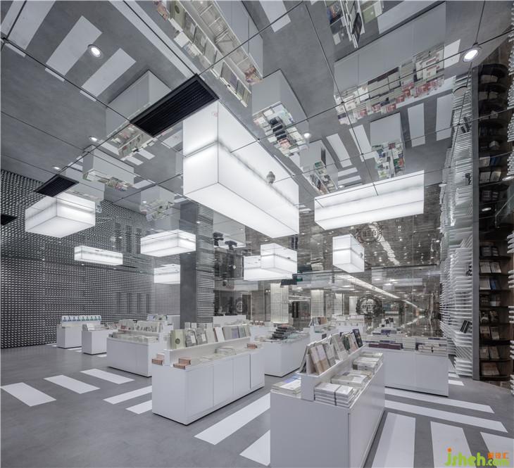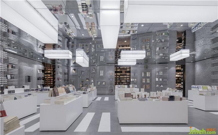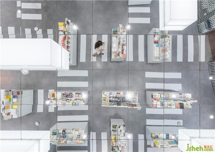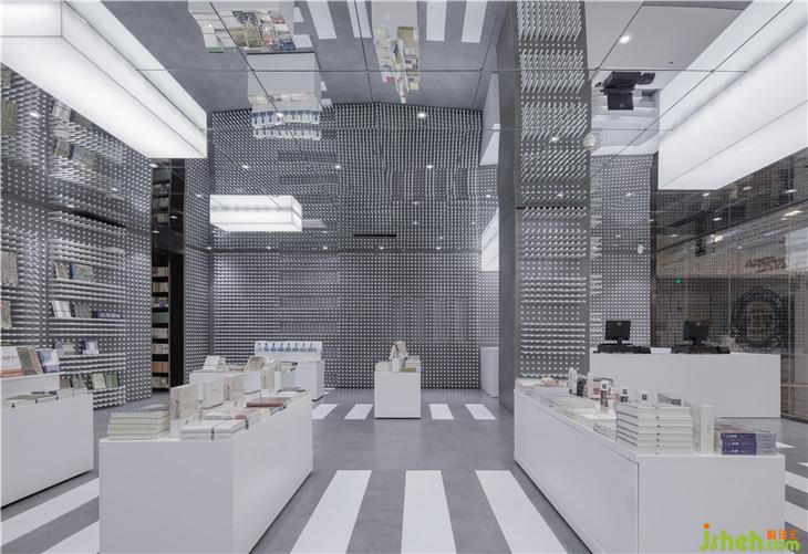 乘坐電梯來(lái)到四樓并向深處看去,可能就會(huì)看到鐘書閣的字幕玻璃幕墻,隱約可見其中干凈整潔灰白色調(diào)和諧暈染,安靜的光暈透過(guò)字幕幕墻的空隙傳遞出來(lái)。走近,走進(jìn)。你便知道這次鐘書閣要講的與書的故事與斑馬線有關(guān)。這正是這家鐘書閣要表達(dá)的情懷,也是上海這座繁忙的城市的縮影。素色的混凝土映射著著城市的馬路顏色,白色擺書臺(tái)橫豎有致靜立路面,鏈接每個(gè)書臺(tái)的地面畫著一條條白色的人行橫道線條,明確指引著書臺(tái)與書臺(tái)間的路徑。滿墻陣列的白色的圓管每一根都可以自由伸縮進(jìn)墻體,通過(guò)這樣的機(jī)動(dòng)性可以塑造不同樣式的陣列圖形,這種變換的形式亦是擺放書的架臺(tái)亦同時(shí)更映射了快速變換的社會(huì)現(xiàn)狀。在這里讀者儼然進(jìn)入到了一個(gè)城市空間,但是這里沒(méi)有車水馬龍,只有安安靜靜的路與斑馬線,還有在書臺(tái)上落成山的書。因?yàn)榘唏R線好比那一本本伴隨我們成長(zhǎng)的書籍。在對(duì)的時(shí)間,遇到對(duì)的指引。由此來(lái)表達(dá)書與讀者的精神關(guān)聯(lián)。室內(nèi)設(shè)計(jì)師