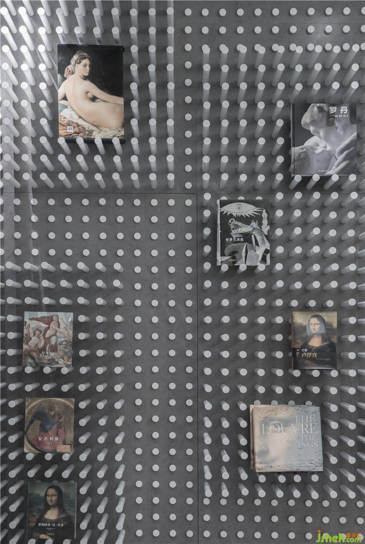 穿越這安靜的圖書公園便來到了書籍的天空之城,一條蜿蜒的路徑貫穿4幢由書架構(gòu)筑成如建筑般的書架,讓讀者體驗穿越在真正的書的城池,在路徑上看在這里每一間房子外的墻都是書架構(gòu)成,而且留有大面積的可透視窗口,可以看見“房子”內(nèi)的情景,但從房子內(nèi)部看則是一個個文化藝術(shù)主題和相應(yīng)的書籍館。4間建筑內(nèi)面積有大有小,小型的猶如一個安靜的書房,大的可以容納小型的讀書會。這里用書記構(gòu)建城市的模樣,與外界喧囂的街區(qū)不同,這里只有安靜與作者之間的隔空交流與感悟的精神世界。書架之間的路徑寬窄漸變,曲徑優(yōu)折間可見地面標示的斑馬路線,這里,恍惚間像是走在上海的百年街道感受浪漫與上海的情懷。室內(nèi)設(shè)計師
