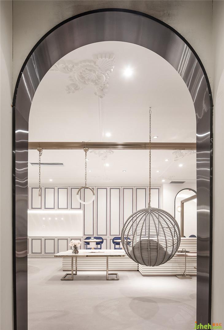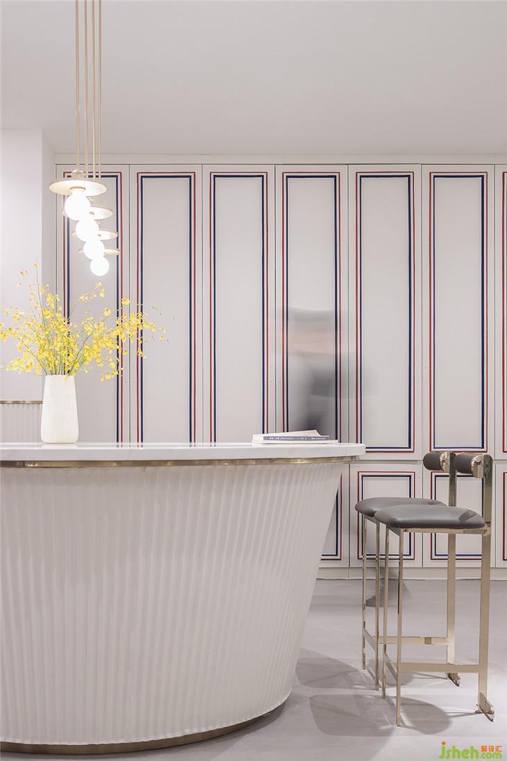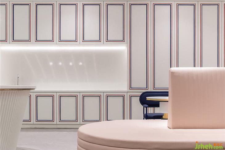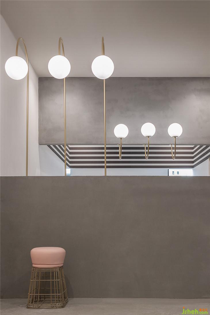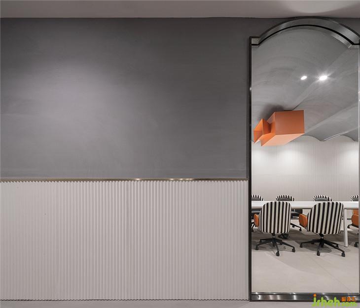 四層作為大型辦公空間,整體的布局上,同三層一樣,分別在兩個(gè)扶梯上來的空間作為公共客廳區(qū)域,大型的辦公室環(huán)繞在客廳周圍,讓每一間公司都能快速的到達(dá)??蛷d區(qū)域依然采用多種的座位形式滿足不同的需求,公共的水吧空間也融合在這里,同時(shí)設(shè)置相應(yīng)的私密休息空間。因?yàn)獒槍?duì)的客群的不同,在調(diào)性上偏成熟穩(wěn)重,在空間里運(yùn)用比較多的木飾面和灰粽色的混凝土飾面。家具也不同于三樓的怪誕色彩,更偏簡(jiǎn)練沉穩(wěn)。這里我們也引用了健身器械的概念,很多卡座和坐凳都引用了按摩椅、瑜伽球的概念,提醒人們?cè)诠ぷ髦嘁材荜P(guān)注一下自己的身體。