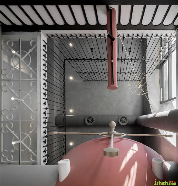 我們把原本是兩層的空間的樓板全部拆除,變成一個(gè)搞達(dá)8、9米的通高空間,在地面用極簡(jiǎn)的手法來還原,這些“反應(yīng)罐”中會(huì)設(shè)置新零售的體驗(yàn)設(shè)備。消費(fèi)者可以在不同的罐當(dāng)中感知不同的設(shè)備帶來的新商業(yè)的消費(fèi)體驗(yàn)感。并在4-5米高的空間中重新搭建樓板,交錯(cuò)穿插在我們還原的“反應(yīng)罐”當(dāng)中作為二樓共享研發(fā)人員辦公的工作與交通平臺(tái),這樣,工作人員在空中的平臺(tái)上工作,消費(fèi)者在樓下體驗(yàn)空間里新科技與信息化帶來的商業(yè)體驗(yàn),通高空間的視線聯(lián)動(dòng)也使得他們可以互相感知到彼此的存在,讓空間變得更加有趣。整個(gè)空間借由工廠構(gòu)圖來搭建的背景下更利用“能量傳送管”的構(gòu)圖來隱藏全部電線與空調(diào)的設(shè)備線路,使得空間暴露出來的工業(yè)化設(shè)計(jì)都被精致的修飾藝術(shù)簡(jiǎn)化,原本應(yīng)該存在空間的工程管線被完美的隱藏在后創(chuàng)作的“能量疏通管”當(dāng)中。更在部分空間使管道聯(lián)動(dòng)到地面上,結(jié)合造型創(chuàng)造了一系列的休息桌椅,使空間看起空間層次豐富但是亦被精致的規(guī)劃為不同視角的構(gòu)圖感。