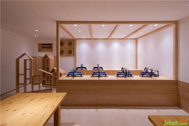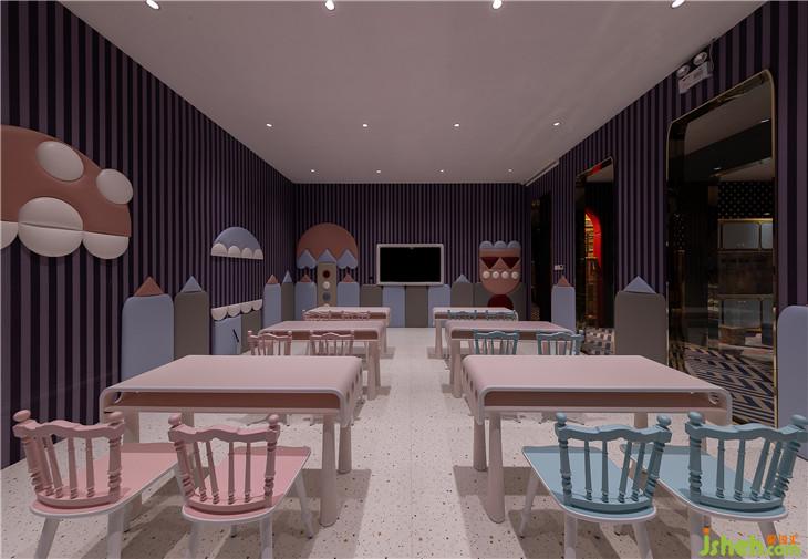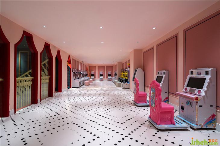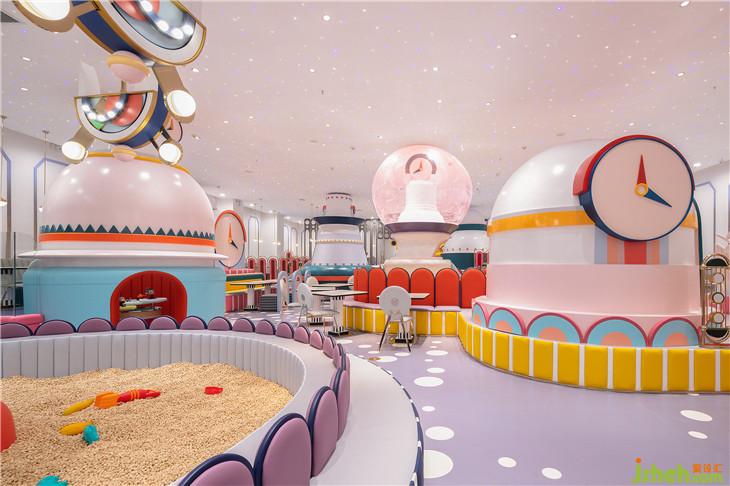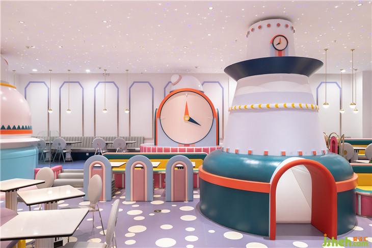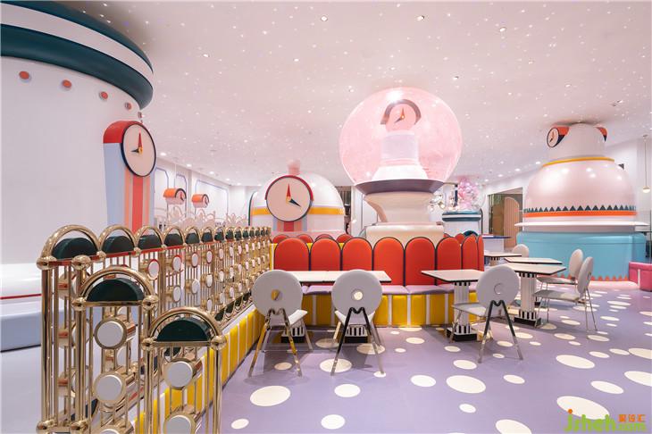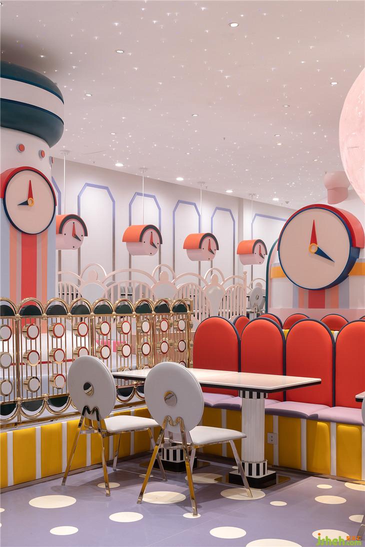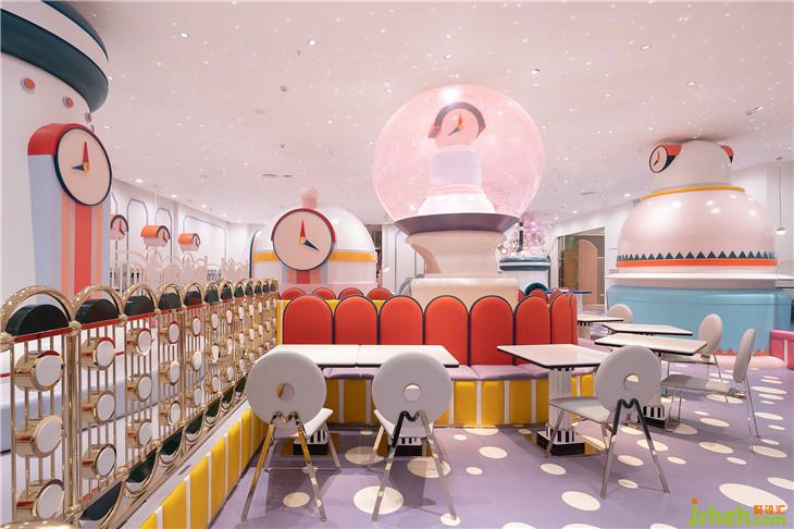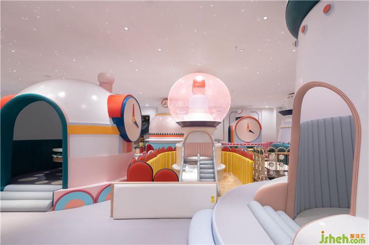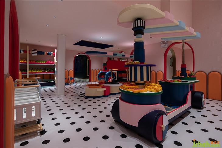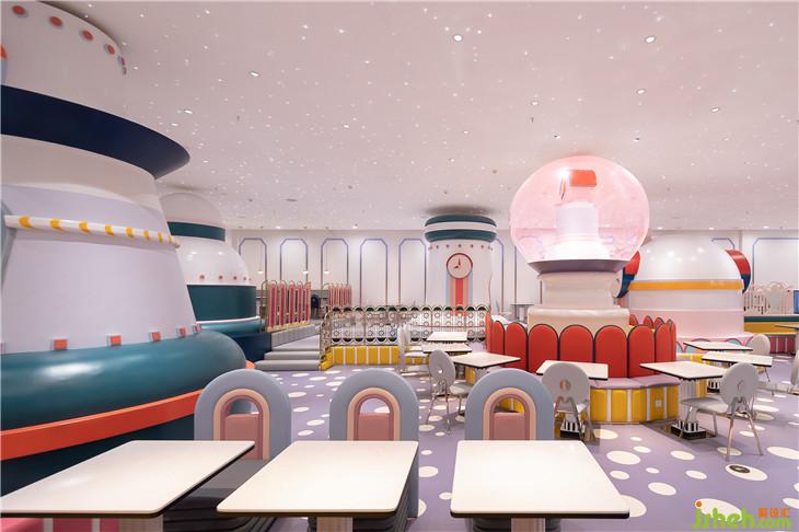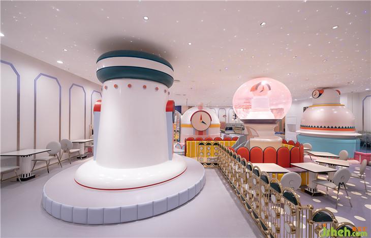 主題性敘事的設(shè)計(jì)表達(dá)同樣延伸到了餐廳區(qū),煙囪模樣的立柱外包裹著透明的淡粉色氣泡,地面不規(guī)則的白色波點(diǎn)象征著云朵。設(shè)計(jì)師假擬了天空的場(chǎng)景,有趣地揭露了MELAND城市制造夢(mèng)幻的秘密。透明氣泡內(nèi)是小朋友的娛樂區(qū),而用餐區(qū)分布在氣泡周圍,既合理利用了空間,也方便家長照看在其中玩耍的孩子。