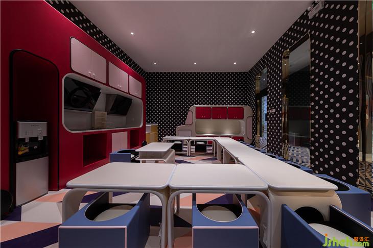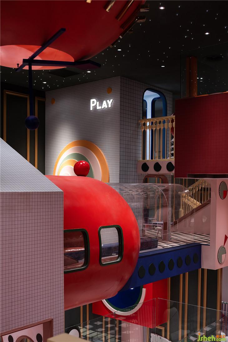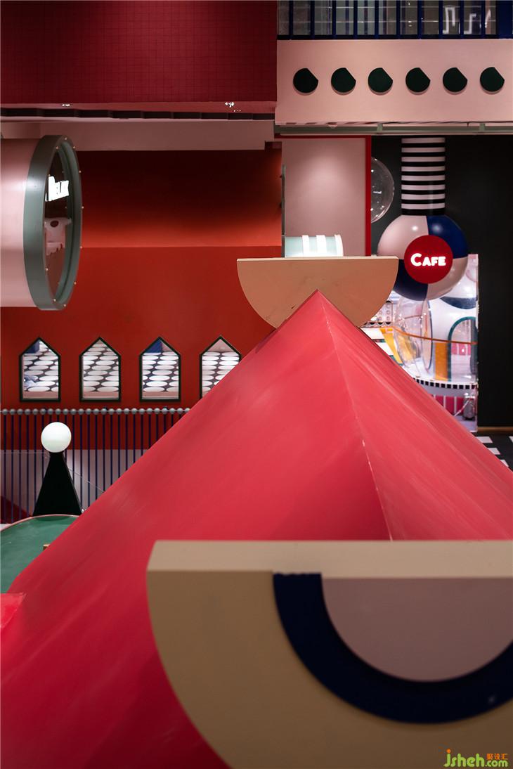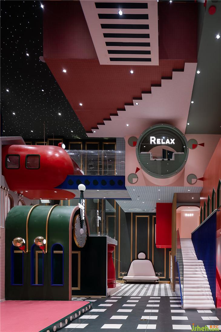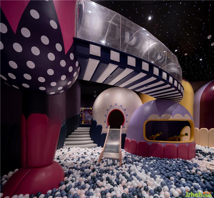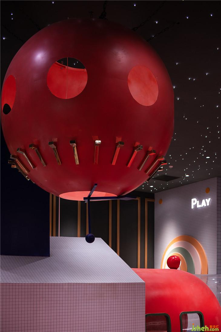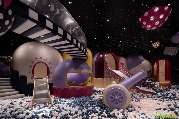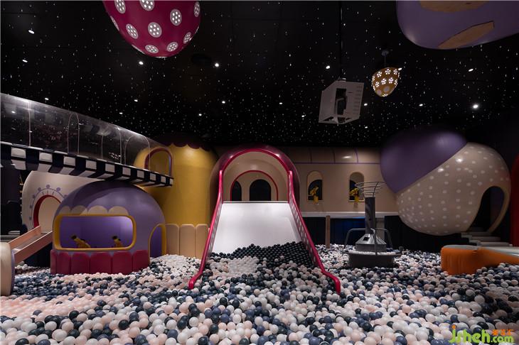 球池區(qū)位于平面空間上的西南角,像是MELAND城市邊緣一塊未經(jīng)開發(fā)的密林。由青蛙和蝸牛藝化而成的大型裝置,包裹住娛樂設施的同時也串聯(lián)起了爬道和滑梯。奇幻紫調(diào)與夸張波點的活潑搭配,刺激著小朋友解放愛玩鬧的天性。與傳統(tǒng)的室內(nèi)攀爬不同,在MELAND的攀爬區(qū),白色的背景墻配以紅色的支點,與延伸到地面的紅色波點,共同堆砌出了這個空間時尚而怪誕的藝術質(zhì)感。