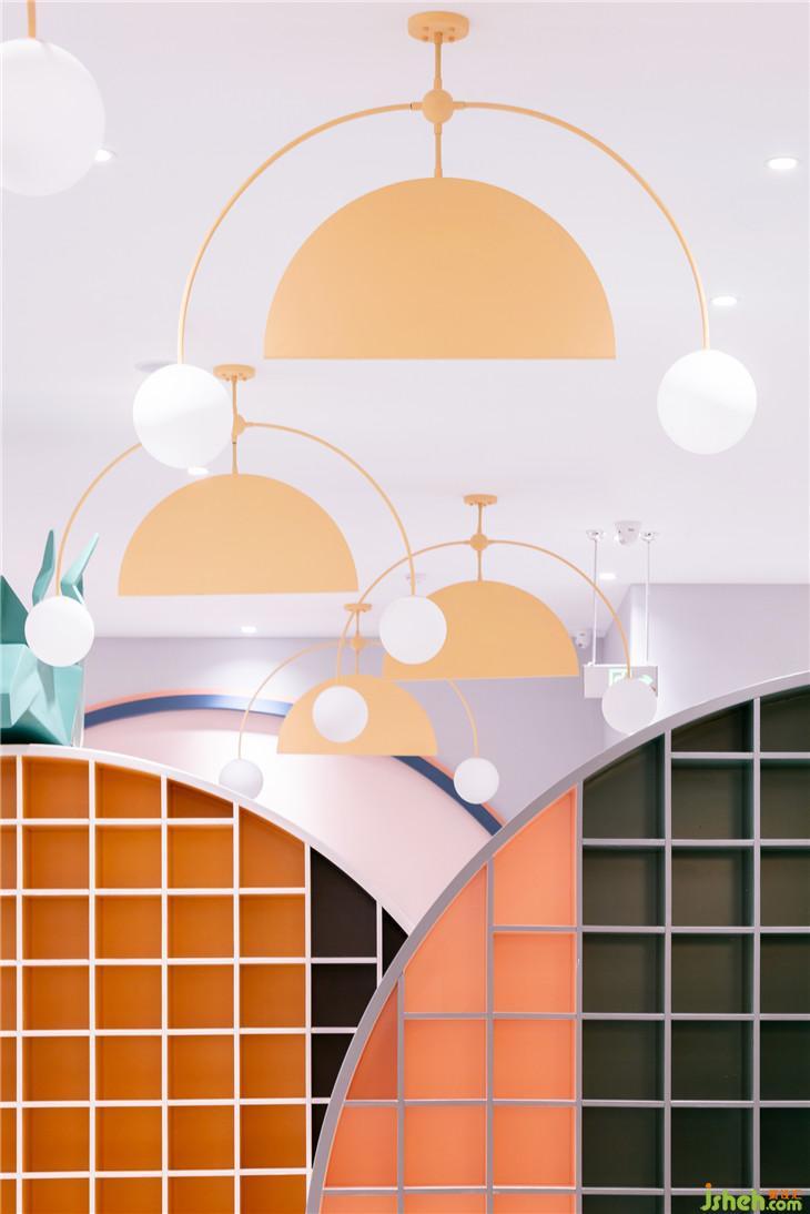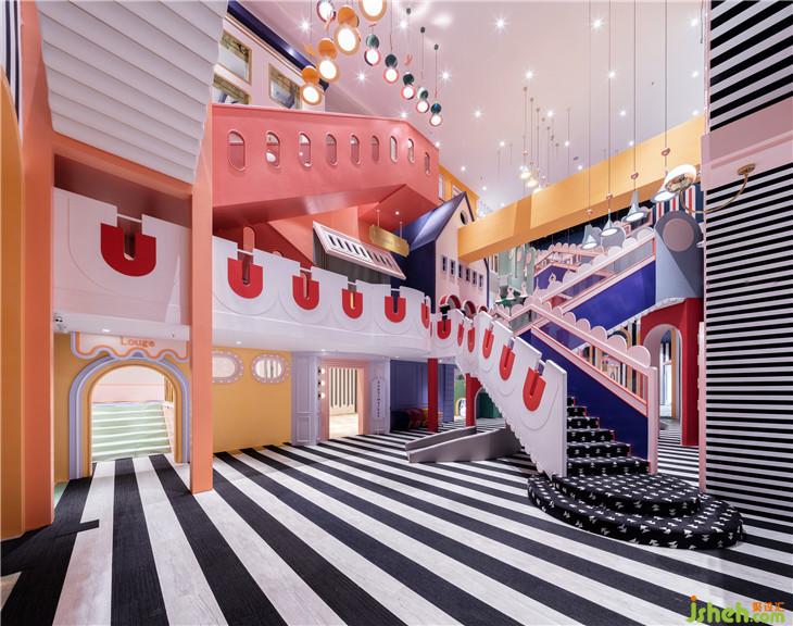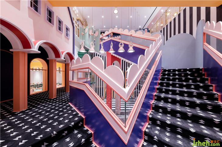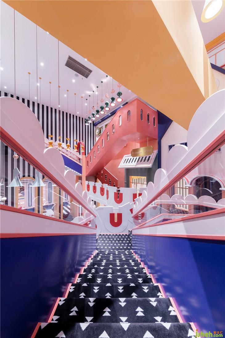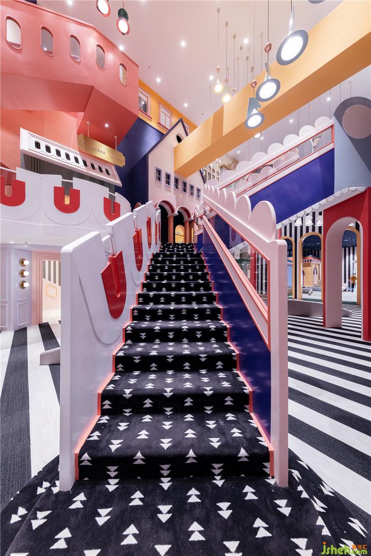 成都店的設計整合了奈爾寶往期作品的優(yōu)點,亮點在于設計師利用了建筑手法,打造了許多不同高度、不同角度的樓梯,堆疊出了一個樓層錯落有致、富有層次的空間。小朋友穿行在其中,像是在迷宮內探險,不斷想要往上探索。迷宮大樓梯是空間的交通樞紐,能引導人流通往位于一層及二層的模擬城與餐廳,路線繁多而不雜亂,道路清晰而又趣味十足。樓梯的護欄充滿了奇趣的設計細節(jié),點綴的波浪花邊、模擬拉鏈的奇妙設計巧思,讓迷宮大樓梯本身也成為空間中一大搶眼的視覺停留點。