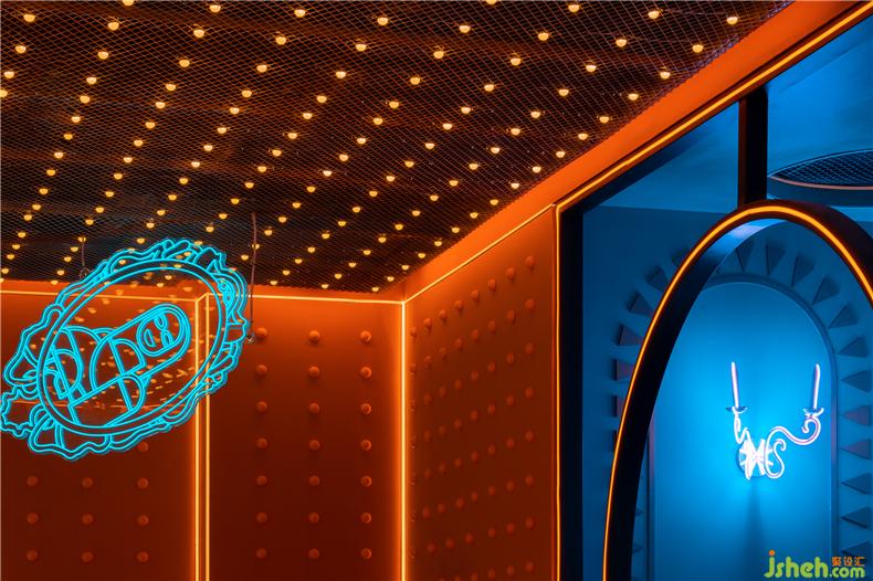 優(yōu)雅的暗紫賽博朋克殿堂與炫酷的電玩風在星際傳奇迸發(fā)出強烈的反差。游樂園設(shè)計形色各異的霓虹燈形成視覺聯(lián)動,幽默臨摹的霓虹式名畫,又為喜愛文藝的年輕人們創(chuàng)造完美的互動點?!翱臻g套盒”的透視手段使不同體量的方形機器與場景的空間關(guān)系得到強化,彰顯豐富的空間構(gòu)圖。一步一景間,秩序美學更為鮮明。