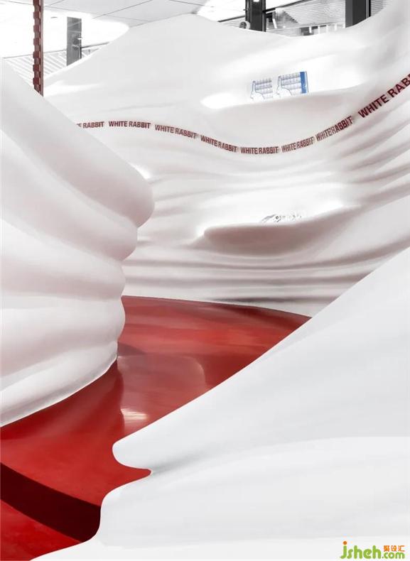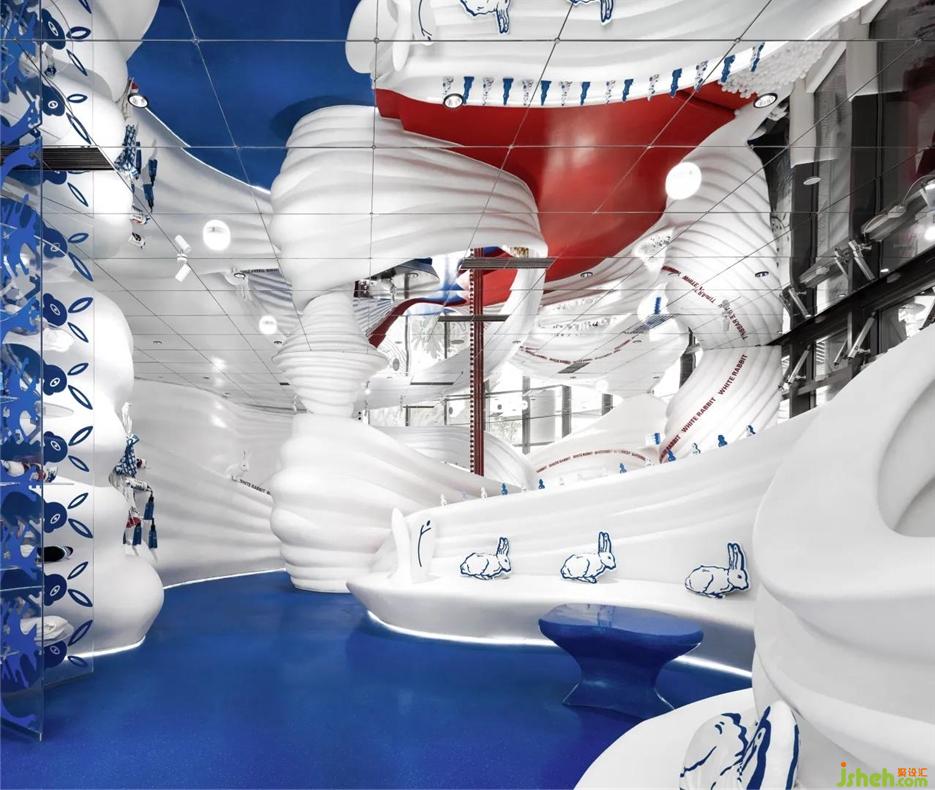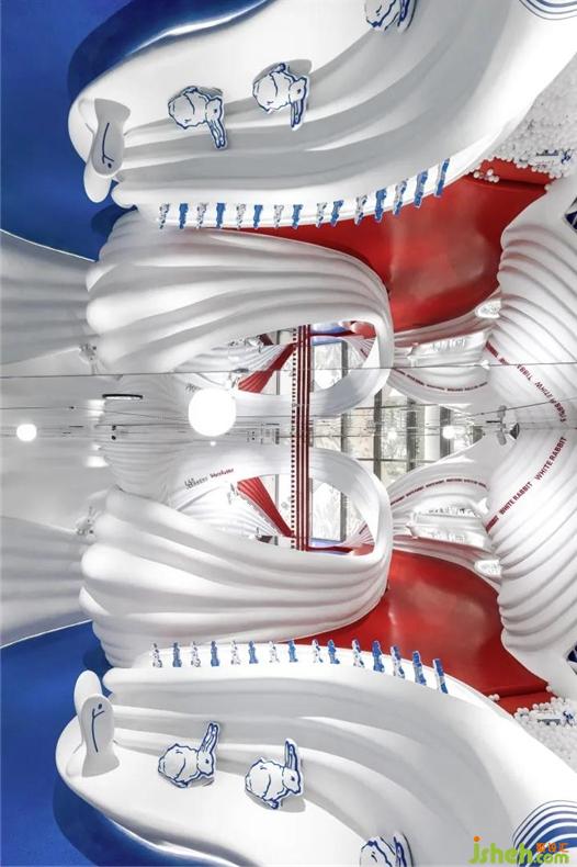 概念的提出宛如一個夢幻的童話,設計師大膽地突破原有格局和傳統(tǒng)零售店設計思路,將整個空間本身轉變成了一個大型藝術性裝置。200余平方米的空間內,3D打印的流線造型模擬出了牛奶的流動感,設計師用藝術化的抽象表達呈現(xiàn)了產品工藝的幽默敘事:流淌的牛奶在空中宛如被施了魔法般,最終變成了貨架上一顆顆奶味濃郁的糖果。臨步行道的幾面墻全部為落地玻璃,室內設計師門店內的整體設計景觀在綠植窗貼的“掩映”下,清晰展現(xiàn)在店外的人群視野內。插畫風的綠植與品牌本身的插畫兔子ip,為整個空間增添了一絲神秘的故事色彩,仿佛是墜入兔子洞后,誤打誤撞進入了一個純白的甜蜜漩渦。不規(guī)律點綴于室內的球燈,暈染出瑩瑩微光,為空間渲染了一層不真實的魔幻濾鏡,令裝置更加富有敘事張力與情緒感染力。