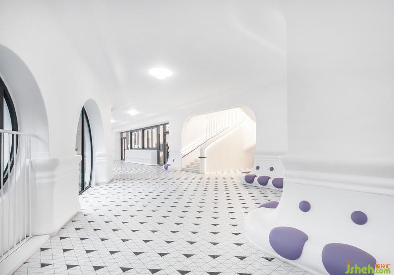 這里既是園內(nèi)每日生活學(xué)習(xí)的交通路線,也是屬于孩子們的美術(shù)館。地面踢腳仿佛云朵的褶邊,幼兒園設(shè)計(jì)結(jié)合軟包工藝設(shè)計(jì)師打造了供家長和小朋友休息的座位。