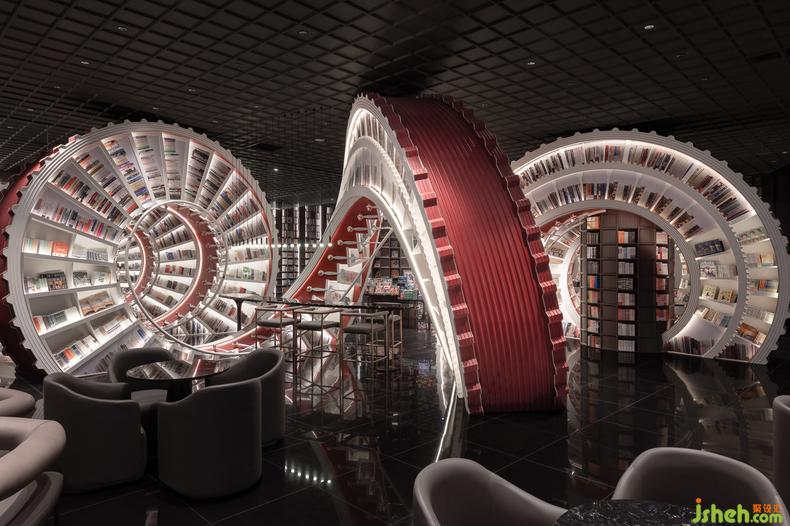 當(dāng)顧客從正面凝視這座螺旋階梯,就可以觀察到一個(gè)個(gè)時(shí)鐘表盤形狀的切面,鐘表指針式樣的扶手具有雙重語(yǔ)境含義,承擔(dān)階梯扶手功能之外也在表盤上投影下指針輪廓,暗喻出這是一座由無(wú)數(shù)時(shí)間累疊而成的歷史之梯,傳達(dá)出歷史被快速推動(dòng)的時(shí)間流動(dòng)感。空間也被恰當(dāng)分割,營(yíng)造出較為獨(dú)一的空間格局,帶給讀者良好的私密閱讀體驗(yàn)