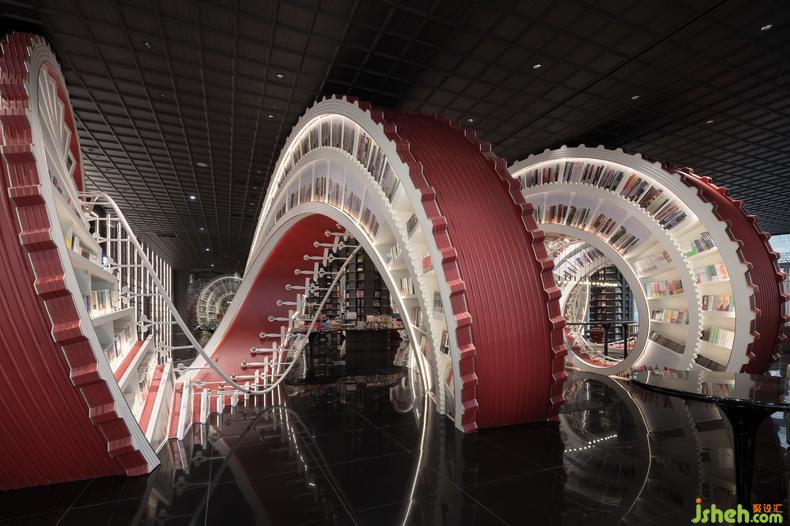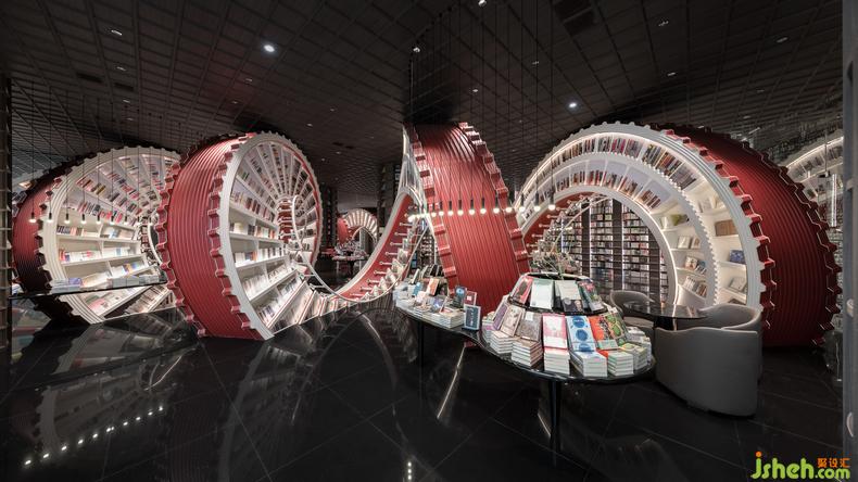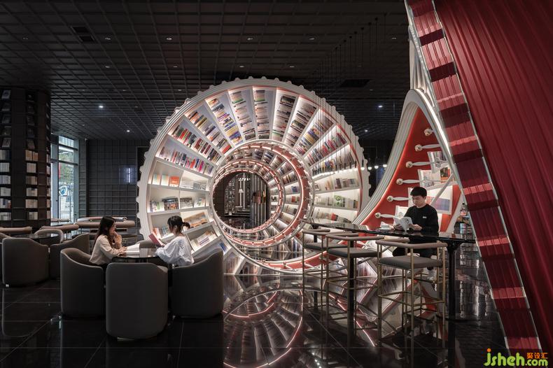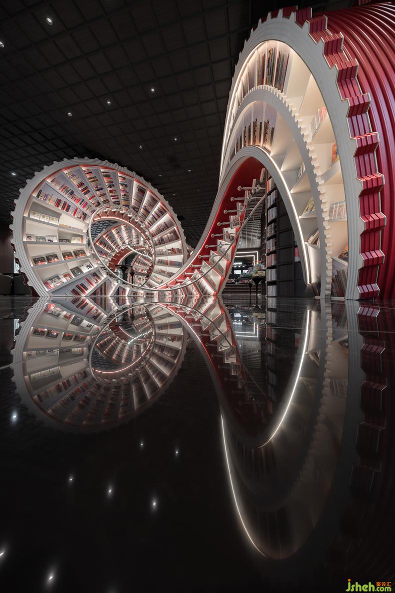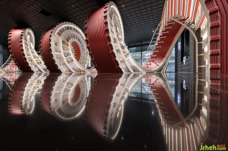 時(shí)間在這個(gè)充滿藝術(shù)性的空間得到具象化的呈現(xiàn),龐大的螺旋階梯書架側(cè)臥于地面,以一道曲線的軌跡貫通整個(gè)概念區(qū),溝通兩個(gè)出入口。