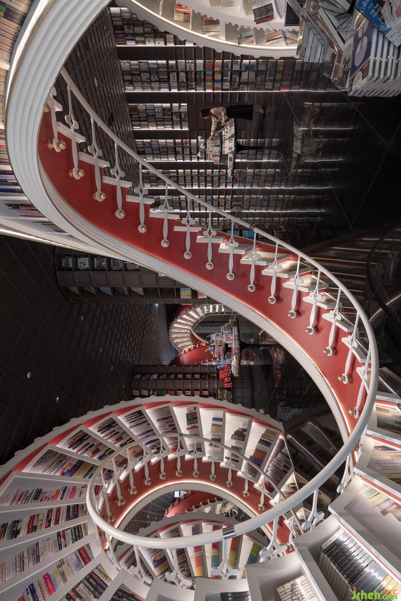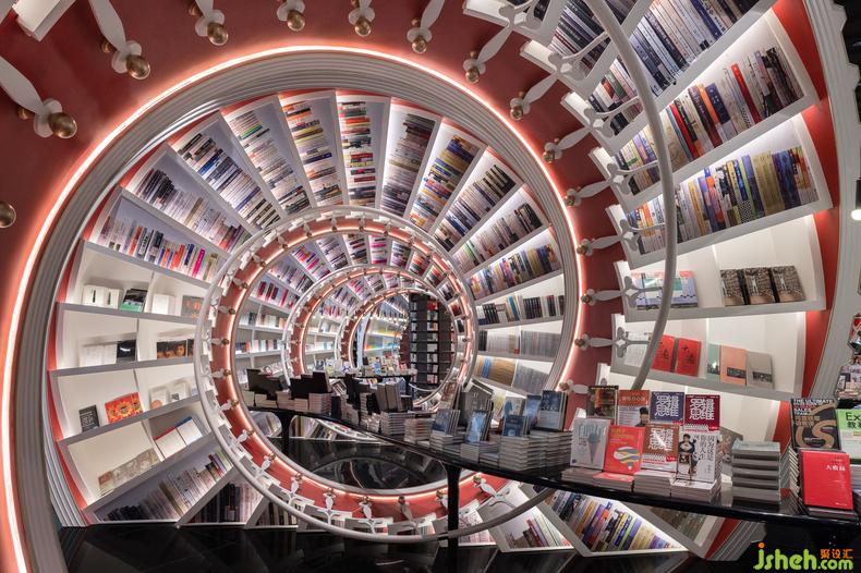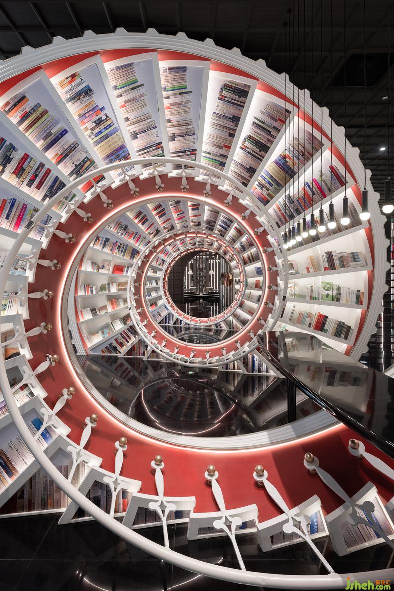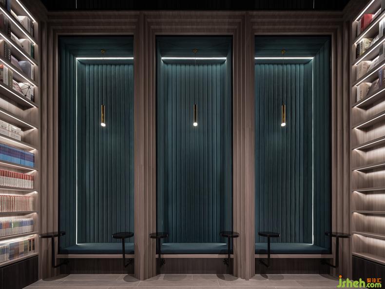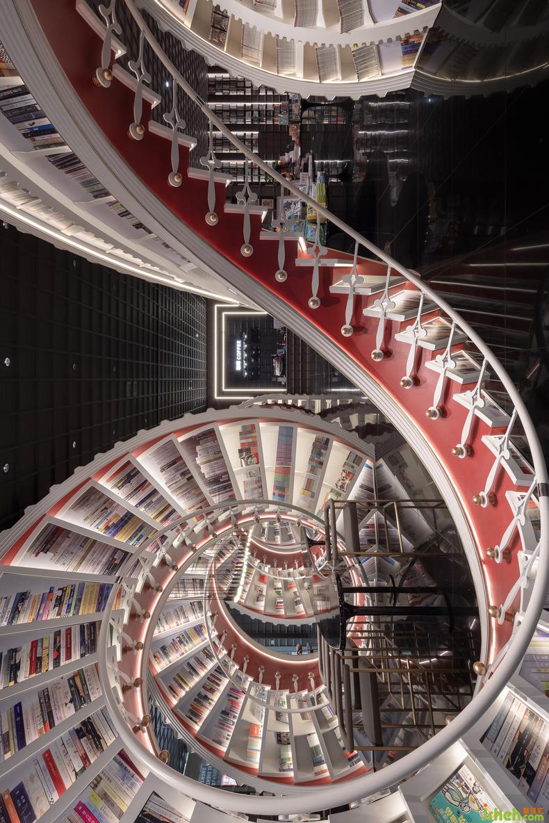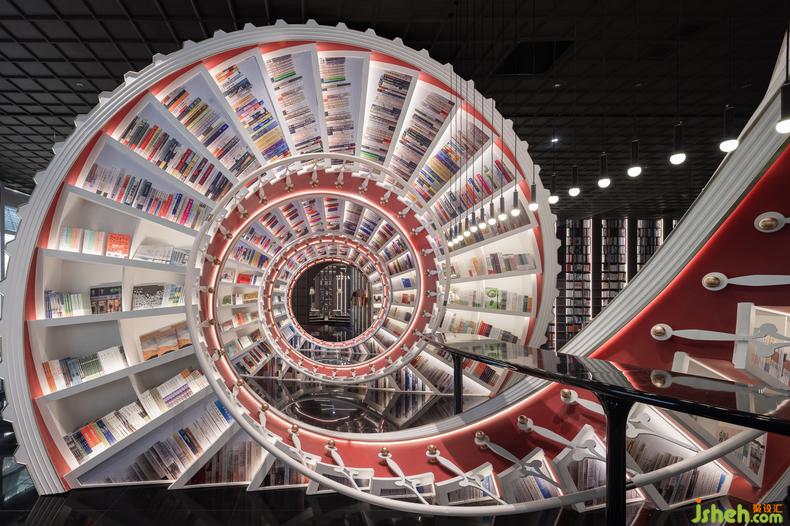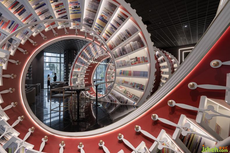 高爾基說過:“書籍是人類進步的階梯。”拉斐爾也曾在名畫《雅典學院》書店設計中讓代表著哲學、數(shù)學、音樂、天文等不同學科領(lǐng)域的文化名人會聚于階梯前探討知識。設計師提取出智慧階梯的美好寓意,將論壇區(qū)典雅莊重的書架整合為綿延的階梯,砌筑出神圣的知識殿堂。