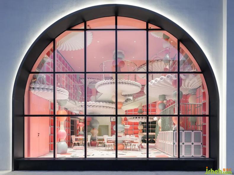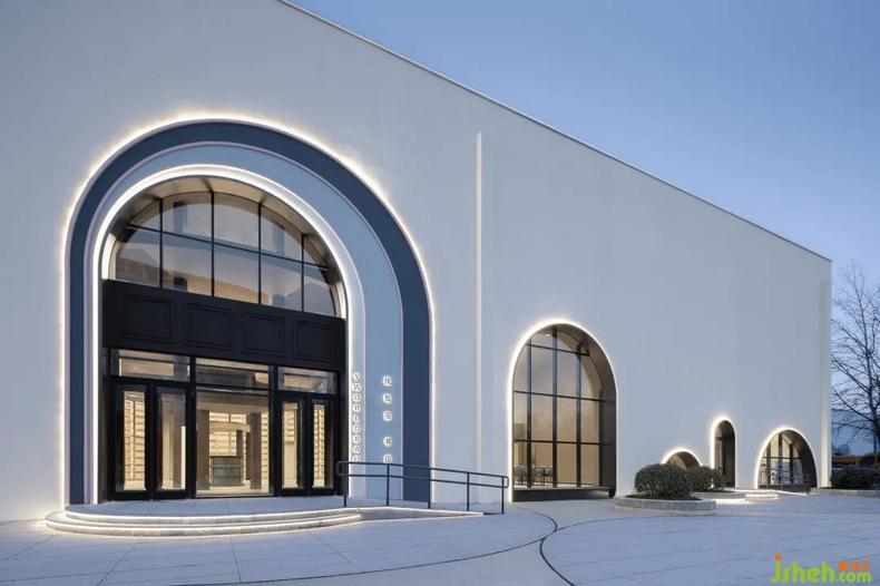 于方形的建筑盒體底部洞開一組大小各異的拱形門窗,曲線增添了些許柔和觀感。門窗中不同區(qū)域的風(fēng)光如畫卷展開,吸引客群的目光,延伸空間內(nèi)部的印象與意蘊(yùn)。入口恢宏的尺度賦予了人震撼的身心體驗(yàn),純白極簡的建筑外殼中包裹的極致夢幻內(nèi)核眼入眼簾。