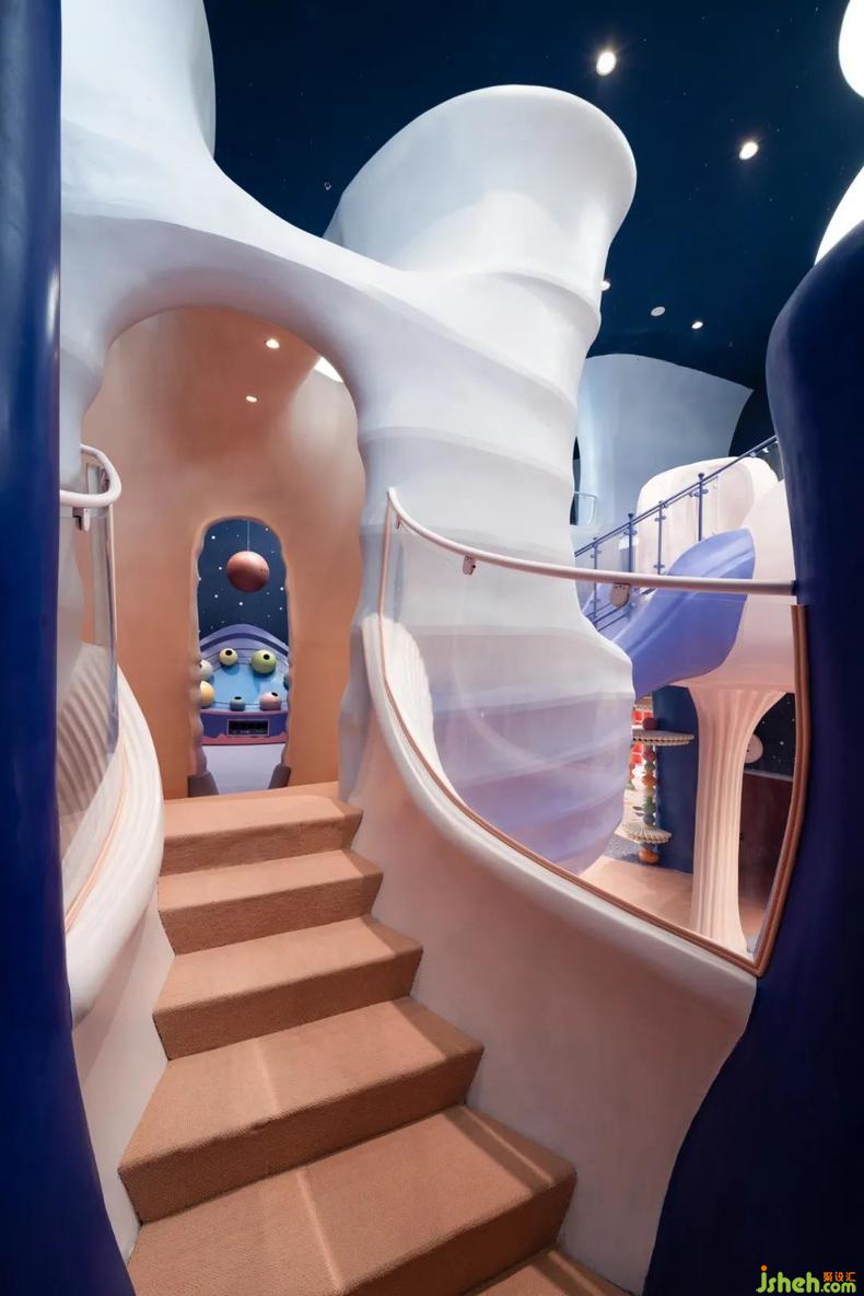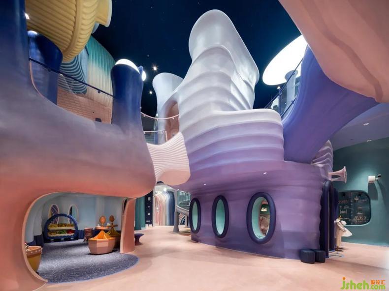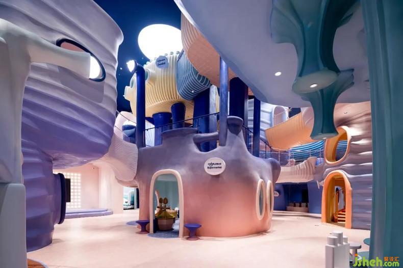 樂園設(shè)計(jì)抽象出珊瑚的形態(tài),再重構(gòu)為一座座爛漫的珊瑚房子,彼此連結(jié),簇集為千姿百態(tài)的珊瑚礁樂園。天花板上的夜空星光安靜灑落,珊瑚悄然呈現(xiàn)著夕陽余暉下漸變的多彩。高約十米的模擬城下,設(shè)計(jì)師打造出一場屬于深海的神秘盛會(huì),孩子們沿著流暢的動(dòng)線穿梭于立體層次豐富的模擬城,如一只只漂浮在珊瑚礁中的小魚,探索眼前應(yīng)接不暇的新奇風(fēng)光,體悟海洋作為生命搖籃的偉大。