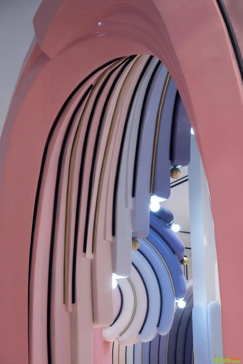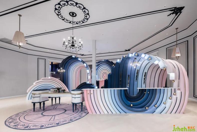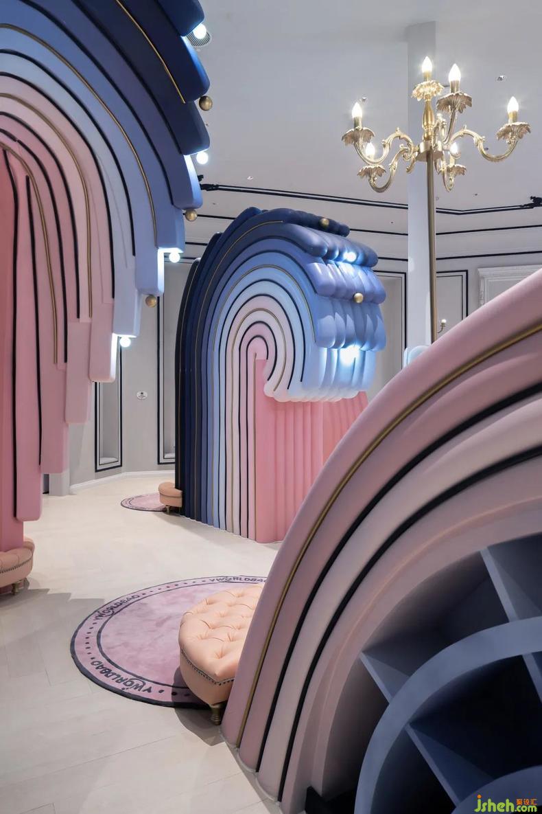 當(dāng)客人步入接待換鞋區(qū),聆聽眼前海洋的潮汐奏鳴。設(shè)計(jì)師將功能和美學(xué)統(tǒng)籌為整體,藝術(shù)性地提煉浪花元素演化為鞋柜與服務(wù)臺(tái)。樂園設(shè)計(jì)形如彩虹的甜美浪花在室內(nèi)翻騰,堆疊出瑰麗的海面,以多功能L形前臺(tái)為中心的單向動(dòng)線串聯(lián)了接待區(qū)和零售區(qū),并激活服務(wù)臺(tái)對雙區(qū)的服務(wù)屬性。