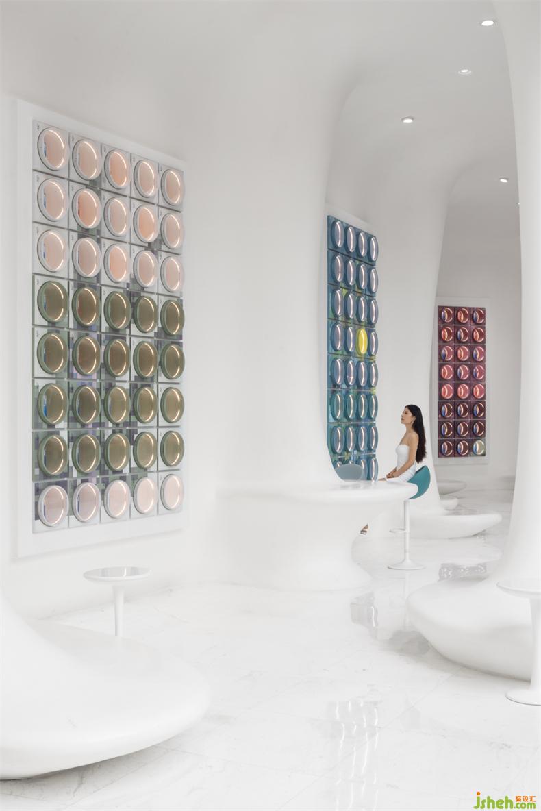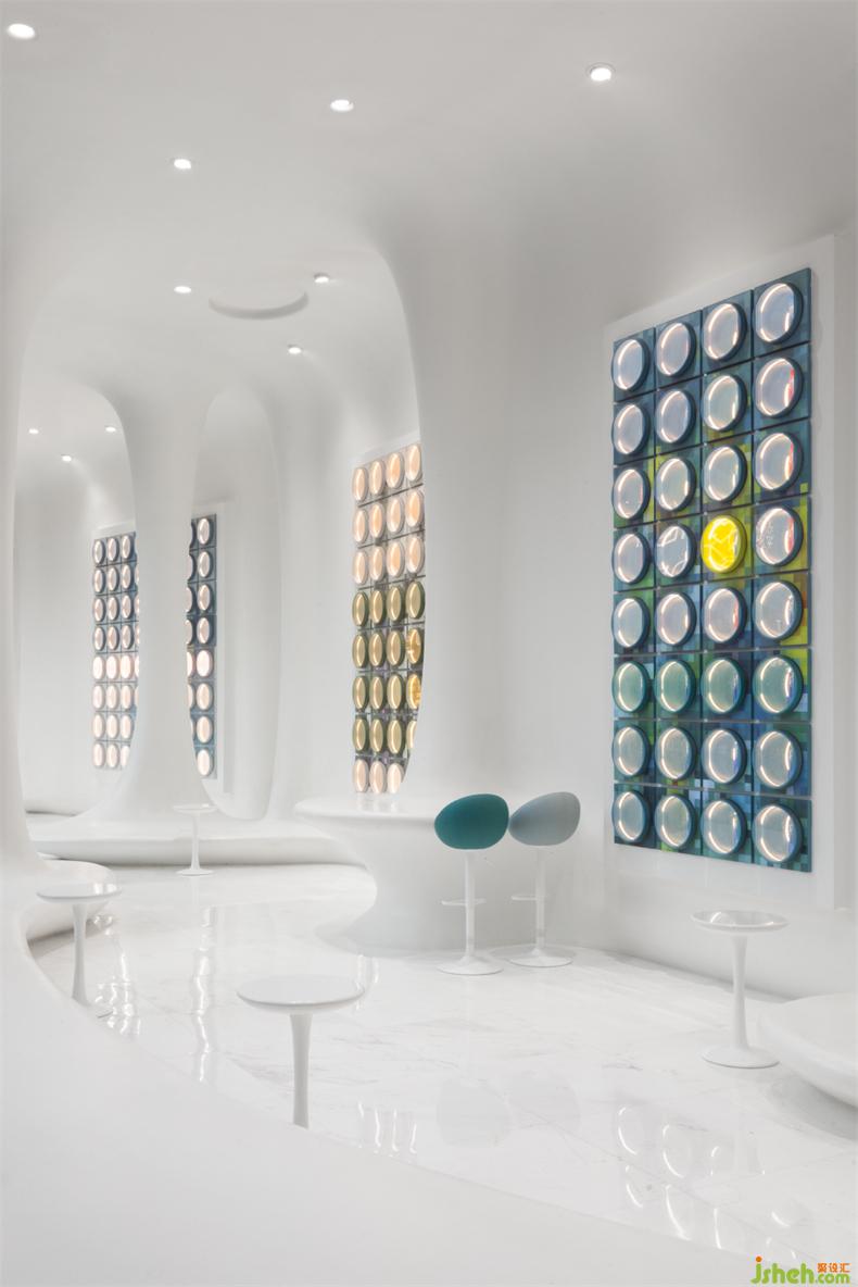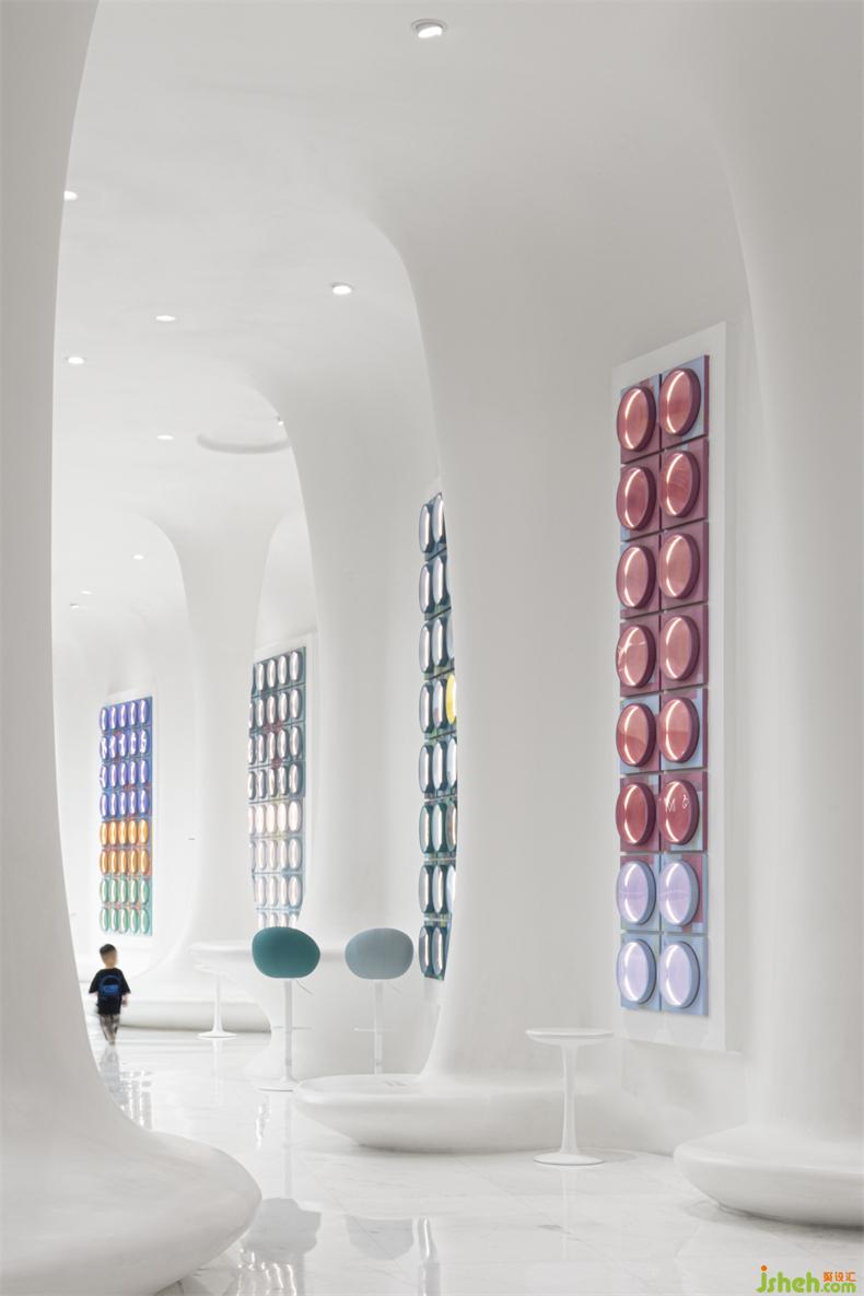 通道唯一的墻面既是零售區(qū),也是藝術(shù)展陳面。室內(nèi)設(shè)計(jì)師初始的可用墻面積并不足夠。因此,設(shè)計(jì)師捏制出一方曲線狀的墻壁,與初始?jí)γ婧蠂鰝}(cāng)庫(kù),從而解決零售區(qū)使用面積不足的問(wèn)題??臻g端頭的陳列展示墻詮釋著秩序的美感。