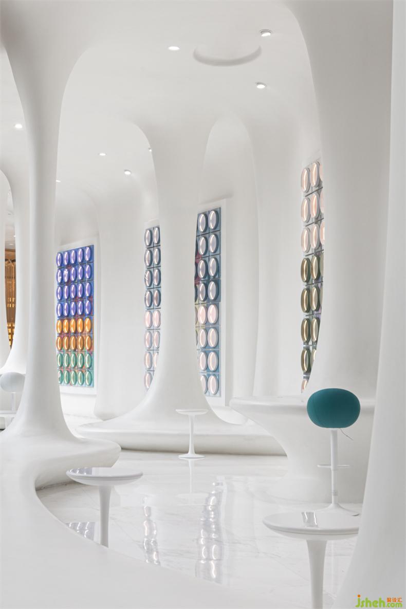 “睡起秋色無(wú)覓處,滿階梧桐月明中?!痹O(shè)計(jì)師用純白柱體模擬生長(zhǎng)的梧桐枝干,室內(nèi)設(shè)計(jì)師南京城里隨處可見的梧桐,遂在此生息。