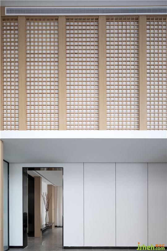 在墻這類實隔上覆以小格子線條勾勒的木格柵,淡化了邊界存在感,韜藏本真之美的原木、玻璃與小面積石材,藉由種種素樸無鑾素材,讓場域遞送著一派和潤素拙的味道。