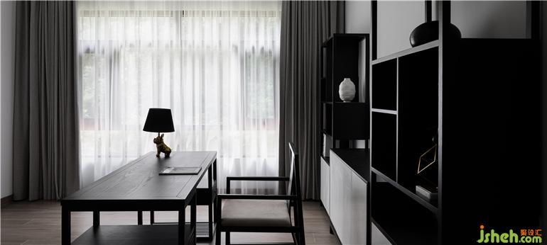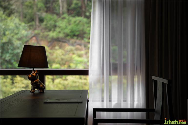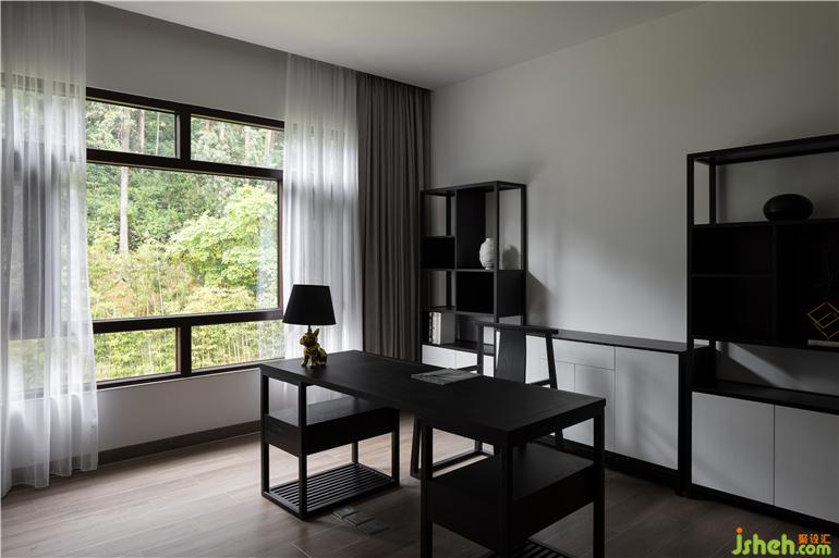 三層的主臥套間舍去厚重的裝飾,給人自然平衡的簡約感,傳達(dá)了人居生活的最佳狀態(tài)。陽光透過落地玻璃窗給沉穩(wěn)的書房撒上一道美景,每一件單品,每一種材質(zhì)都在同一空間里呼吸著,互相交織,呈現(xiàn)出極簡設(shè)計的安靜與美好。主臥臨山而設(shè),書房飄窗,可欣賞室外山水好景。