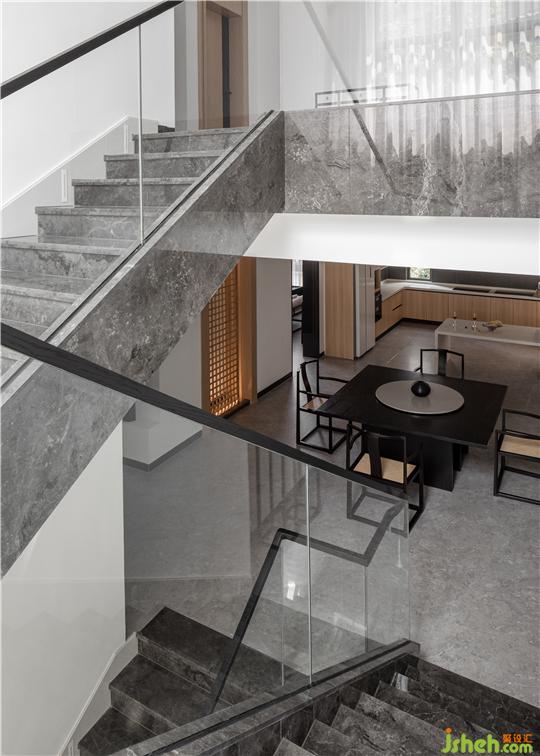 石材而成的轉(zhuǎn)角樓梯,透明玻璃隔板的扶手讓光線進入的同時,又巧妙地顯露了樓梯的特征、創(chuàng)造出非凡的燈效及空間深度。