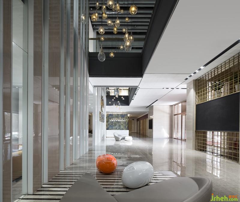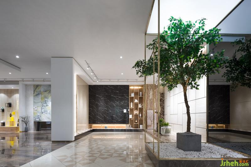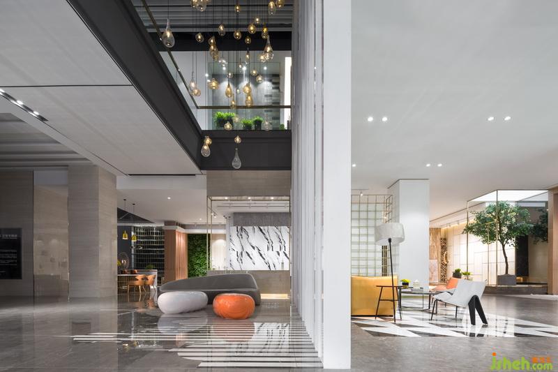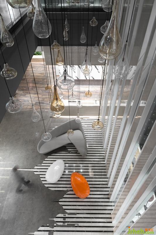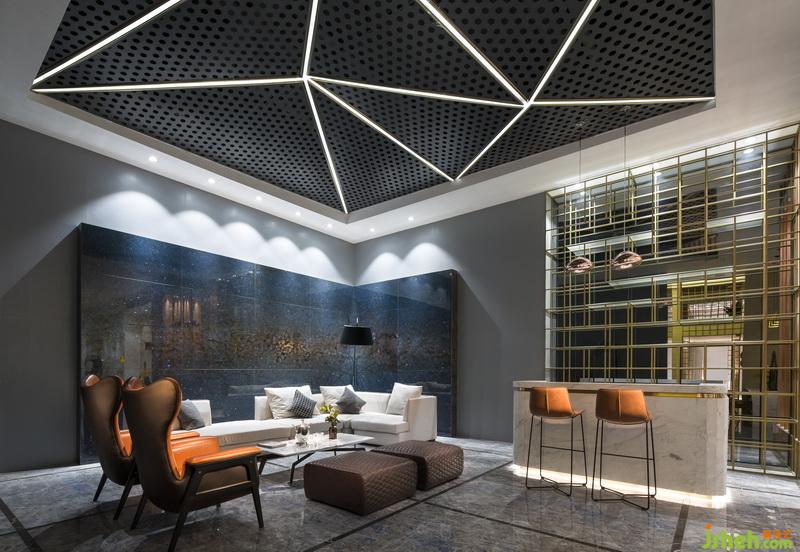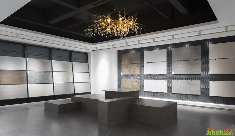 該項目共三層,根據(jù)功能需求室內設計師規(guī)劃首層為品牌形象大堂、休閑接待、大理石系列產品的選材與應用;二層為現(xiàn)代仿古磚系列產品的展示與應用;三層為常規(guī)產品和墻面磚產品展示與應用。室內設計師在品牌設計定位和功能規(guī)劃確定的前提下大膽的對空間進行設計表現(xiàn),最具創(chuàng)意的是室內設計師將一二層樓板打開了兩個長方形的中空,在不破壞建筑結構的情況下打破了常規(guī)的單一方正的中空設計,起到意想不到的空間效果。大堂頂部兩個長方形的小中空讓一二樓增強了建筑空間感和空間互動性,正面直線形的造型設計拉長空間高聳,加上一直連接到天花的白色鋁條,如同一道道極光,是連接兩極的關系。在中間夾著玻璃發(fā)光的雪花和天花吊著的圓形玻璃燈泡,白雪飄落和溫馨優(yōu)雅的空間結合,讓人處身于這塊最為粗礦和神奇的土地上。左邊休閑洽談空間個性的天花結構像閃電一般,結合立面的銀河圖案,讓世間的一些復雜回歸簡單和寧靜。