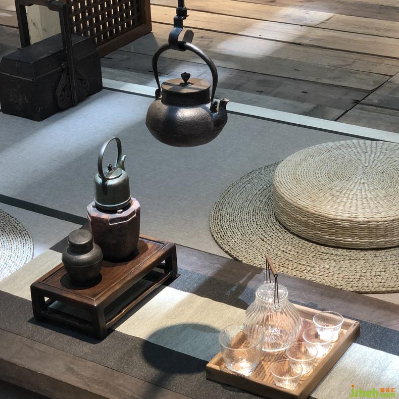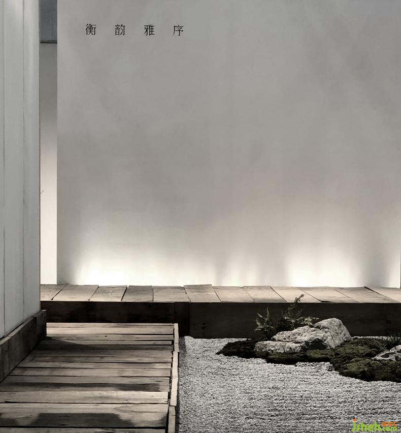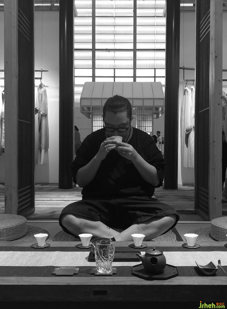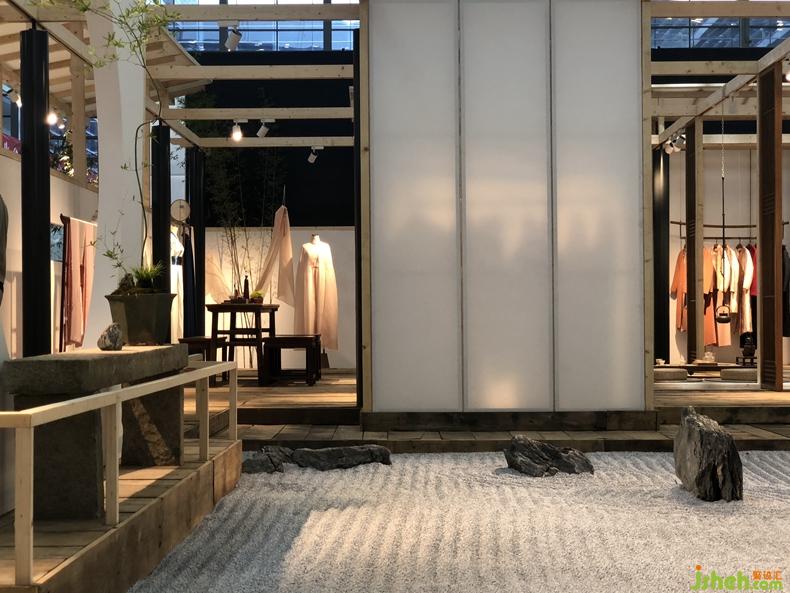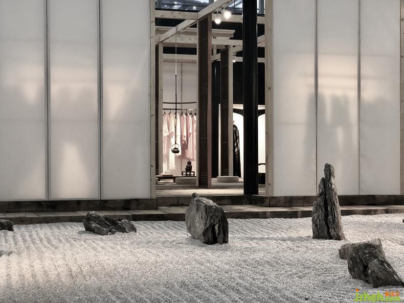 從石庭穿過透光屏風(fēng)后呈現(xiàn)的是更加純粹的東方文化情境,筆墨茶煙,青苔蒲草處處有情,面面生意,余味不盡??臻g軸線上對(duì)應(yīng)的長條屏風(fēng)既分割空間又留有余地,席地茶席的布置器物樸雅有妙韻,自成佳景。衡韻雅序陳列的錦繡羅衫于此情境中已然是無需任何渲染的一種靜態(tài)藝術(shù)。