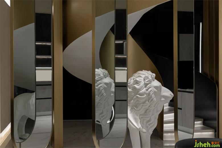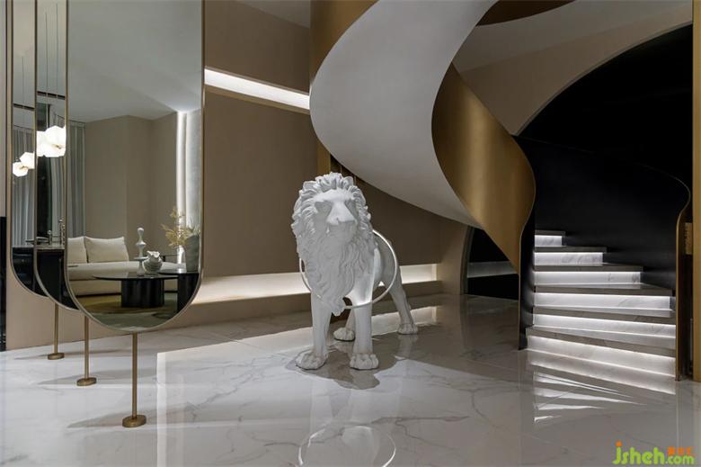 獅子落地?zé)舫蔀榭臻g旋轉(zhuǎn)樓梯下的點(diǎn)睛之筆,藝術(shù)注于空間有了靜謐、靈活的氣息,與空間造型相得益彰。