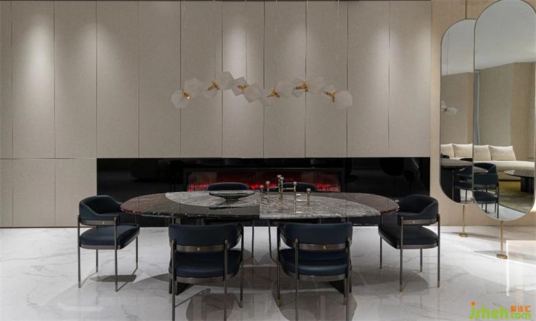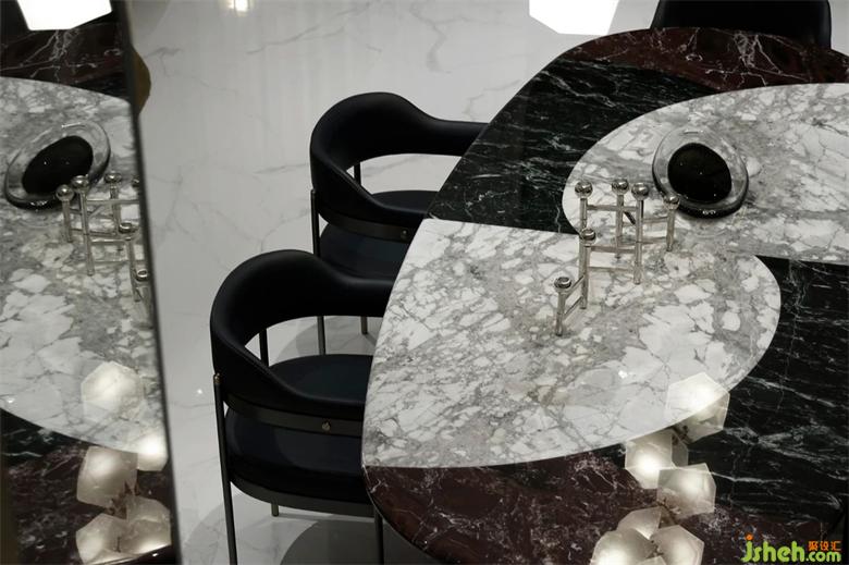 餐桌由整個(gè)寒江雪石材所打造,保留了其自然溫潤(rùn)的質(zhì)感,