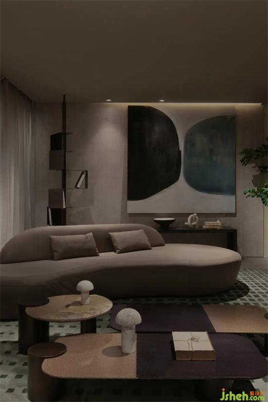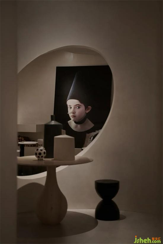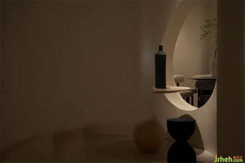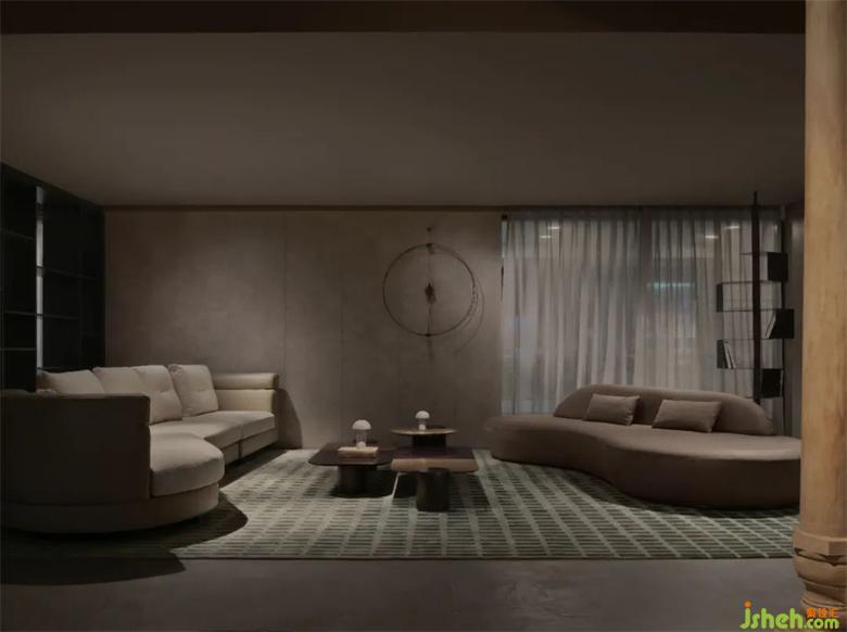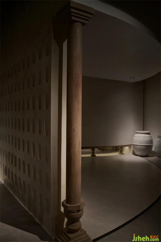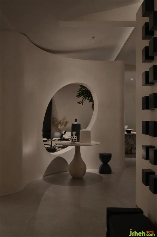 家居館設(shè)計區(qū)別于前廳的精致感與現(xiàn)代感,后場運(yùn)用了更加自由的設(shè)計手法,弧形通道將來客吸入到Art展區(qū)之中,屹立于整個空間中心的結(jié)構(gòu)柱本應(yīng)該是個麻煩,經(jīng)過弧形與切面的塑造卻成為了一個空間焦點,像是藝術(shù)家創(chuàng)作的一件雕塑作品,家居館設(shè)計在自由的曲線之下,不同形態(tài)的羅馬柱散落其中,從入口處的立柱,到弧形墻面的腳墩,配合水紋玻璃在燈光下投射的陰影紋理,像是要娓娓道來一個童話一篇詩章。