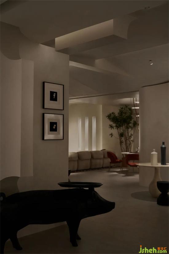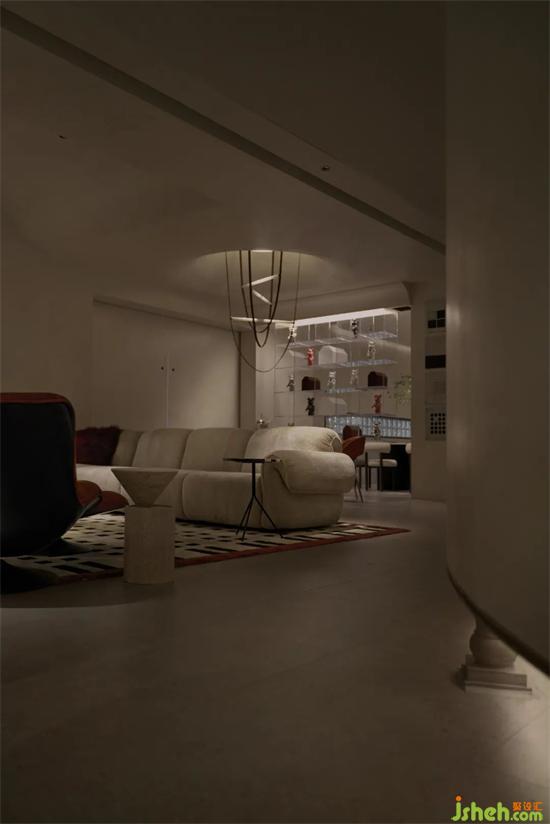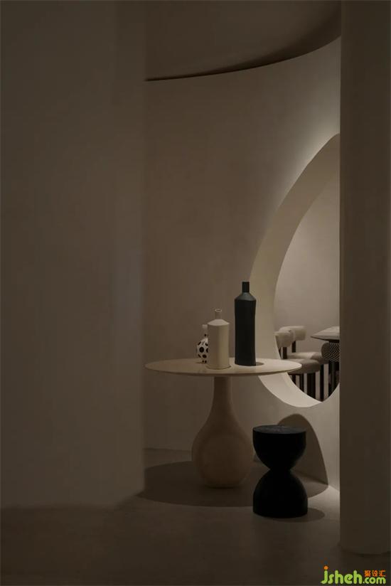 為了讓客人穿過前廳后能對后場區(qū)域繼續(xù)保持新鮮感,我們在Living和Art展廳區(qū)域交界處創(chuàng)作了一個(gè)裝置性的藝術(shù)通道,人們會被這個(gè)內(nèi)建筑所吸引,具有吸引力的弧形墻體能讓展廳瞬間轉(zhuǎn)換空間情緒,神秘感油然而生,一步一步打開客人的好奇心,家居館設(shè)計(jì)后場濃郁的藝術(shù)氛圍會讓人心情愉悅,浪漫感油然而生。