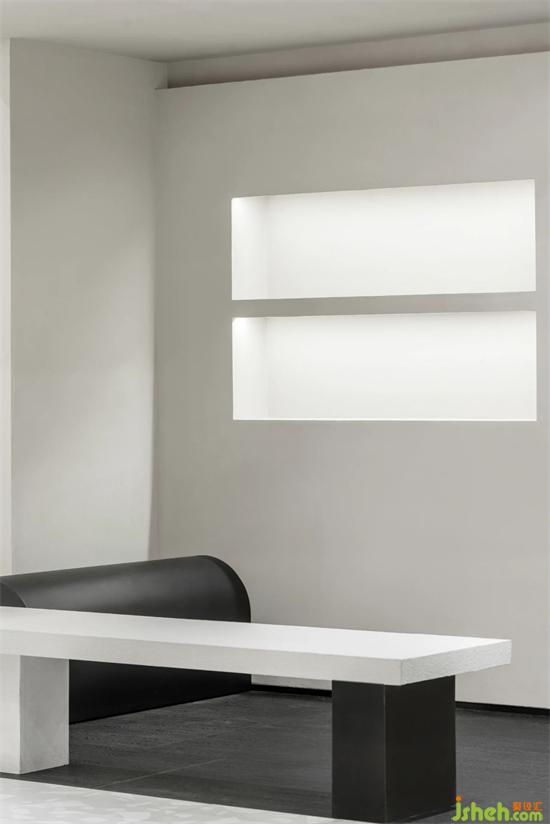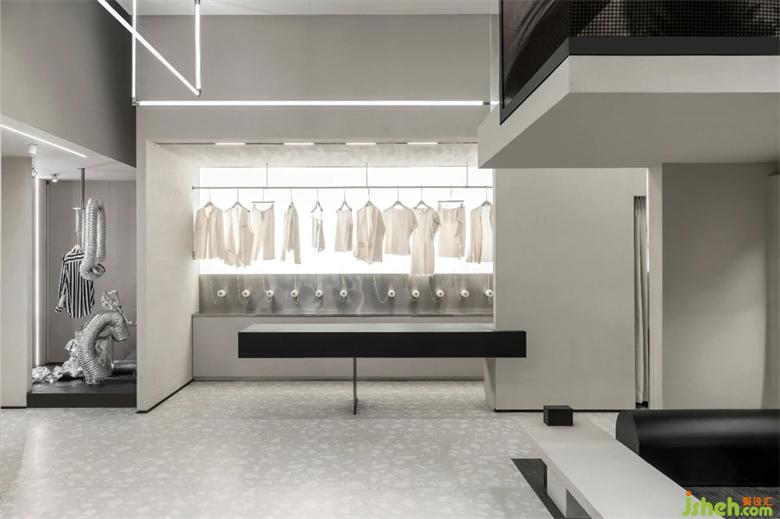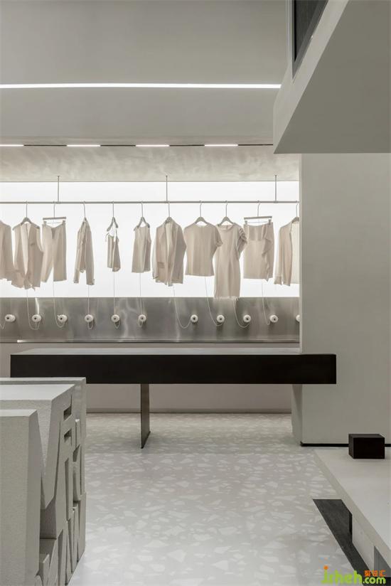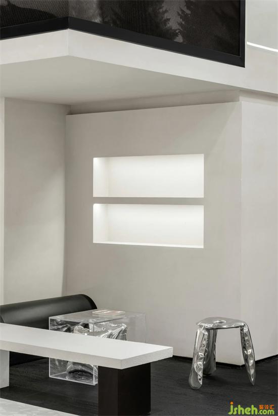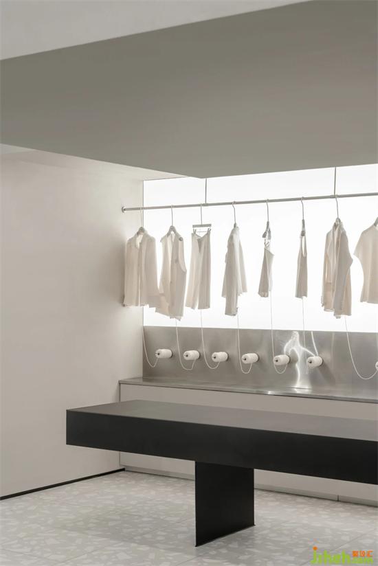 LEDIM WANG除了提供成衣以外,全系列產(chǎn)品也提供尺寸、顏色、面料的個(gè)性化定制服務(wù)。旗艦店設(shè)計(jì)因此設(shè)計(jì)團(tuán)隊(duì)將前臺(tái)接待區(qū)與定制服務(wù)區(qū),兩個(gè)功能區(qū)整合,用框景的手法,結(jié)合背面的定制成衣展示空間,打造出有層次感的復(fù)合功能空間。