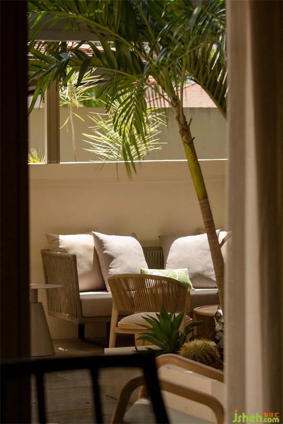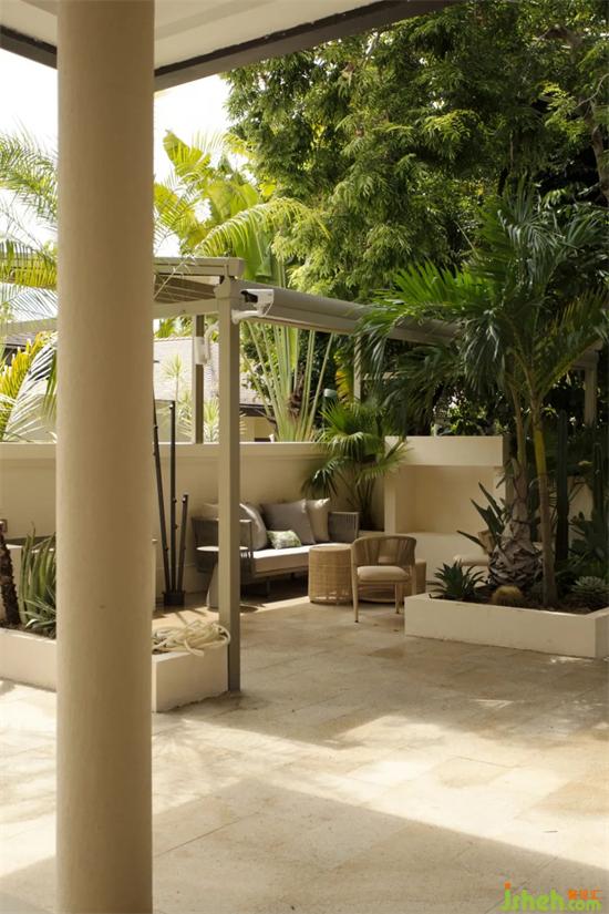 靠近院落花園的部分則采用金屬結(jié)構(gòu)防水電動(dòng)收合簾來保證戶外院落使用時(shí)不被雨水打濕。前院及后院我們都采用統(tǒng)一手法,將整體顏色及元素結(jié)構(gòu)統(tǒng)一,簡(jiǎn)潔安靜中融入質(zhì)樸的美。雖靠海而居,小區(qū)綠意盎然,歸家至此卻不見山河園林,稍顯寡淡。別墅設(shè)計(jì)團(tuán)隊(duì)將鄰近處的花園及建筑作背景喻作山巒,朝“山”而觀,設(shè)計(jì)園林,引入熱帶獨(dú)有的植被,增強(qiáng)室內(nèi)與景觀的聯(lián)系,在建筑內(nèi)置入一個(gè)長(zhǎng)性空間,作為室內(nèi)的重組的延續(xù)和體現(xiàn),把一步一景和光引入室內(nèi),內(nèi)與外都有了互換體驗(yàn)。