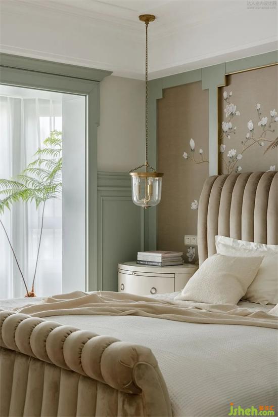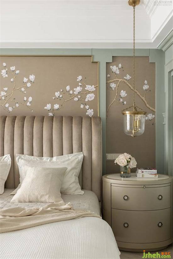 走進(jìn)主臥空間,極其擁有線條感的墻板,搭配著擁有柔軟質(zhì)地的織物,把內(nèi)屋的門框設(shè)計(jì)為氣窗,聯(lián)通主臥、衣帽間及衛(wèi)生間兩個區(qū)域,氣窗可折疊開合,也可調(diào)整窗葉角度,讓整個空間既能隔斷又仍有聯(lián)系。家裝設(shè)計(jì)東方花鳥墻畫猶如海闊天地的意境承載空間里的一切,感覺像是一幅具有東方寫意的畫作,營造出擁有靈動的高級氛圍。