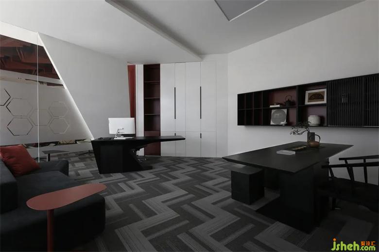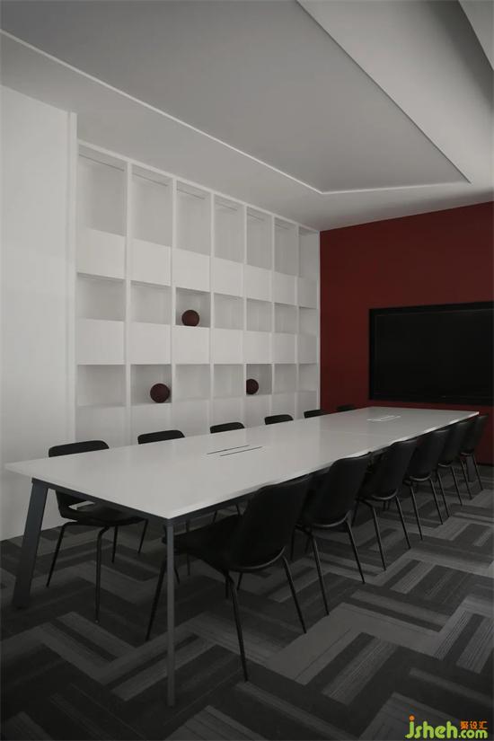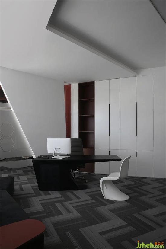 探索事物于不同角度的發(fā)散認(rèn)知,讓動(dòng)線更傾向于自由迂回的環(huán)繞,辦公設(shè)計(jì)簡(jiǎn)潔的紅與白柜體盡可能的少而簡(jiǎn)的空間陳列,通過色彩與材質(zhì)的呼應(yīng),傳達(dá)由近到遠(yuǎn)的視覺延伸。