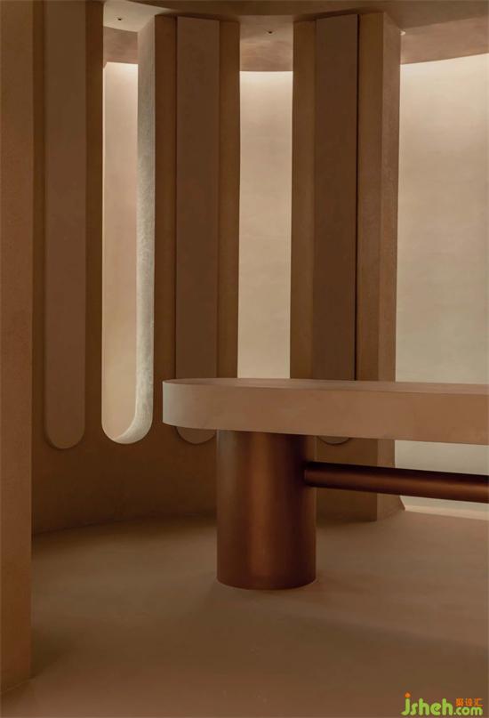 前廳為“動(dòng)”用于傳遞品牌理念、展示產(chǎn)品特性與工藝及自由洽談,“回”字形的人流動(dòng)線為空間持續(xù)增加可讀性與趣味性,又將開放式會(huì)談空間包裹其中,連接兩端廊道,讓人們的動(dòng)線體驗(yàn)更加自由。展廳設(shè)計(jì)后廳為“靜”用于材質(zhì)板陳列、VIP茶室及員工工作區(qū),趨于靜態(tài)的動(dòng)線布局會(huì)使客人專注于產(chǎn)品本身,半圍合的茶室與材料展示區(qū)視野相通,在進(jìn)行私密洽談的同時(shí)也能感受到產(chǎn)品陳列的氛圍感。
