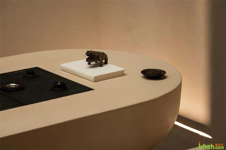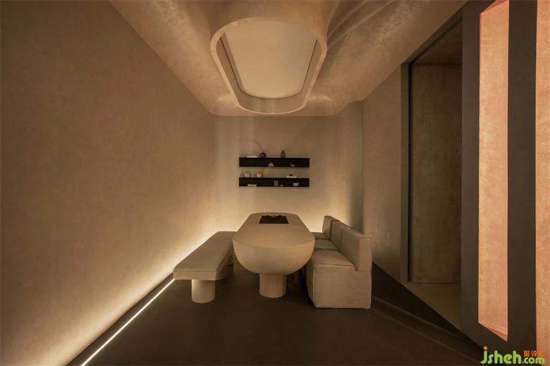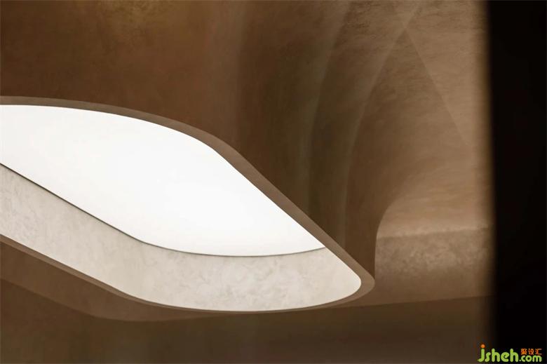 在環(huán)形走廊的的盡頭恰好有兩處新的入口,像是被人發(fā)掘過(guò)一般,垂吊至下的弧形頂棚開鑿出天光,剛好投射在石桌上,而反射至頂面的光線讓整個(gè)空間充滿波光粼粼的金屬質(zhì)感,展廳設(shè)計(jì)發(fā)掘此處的前人可能就在這里飲茶聊天吧。