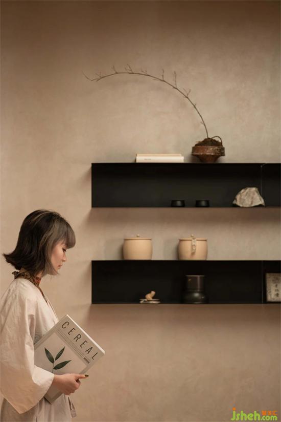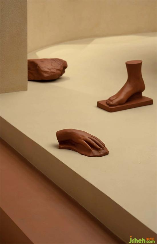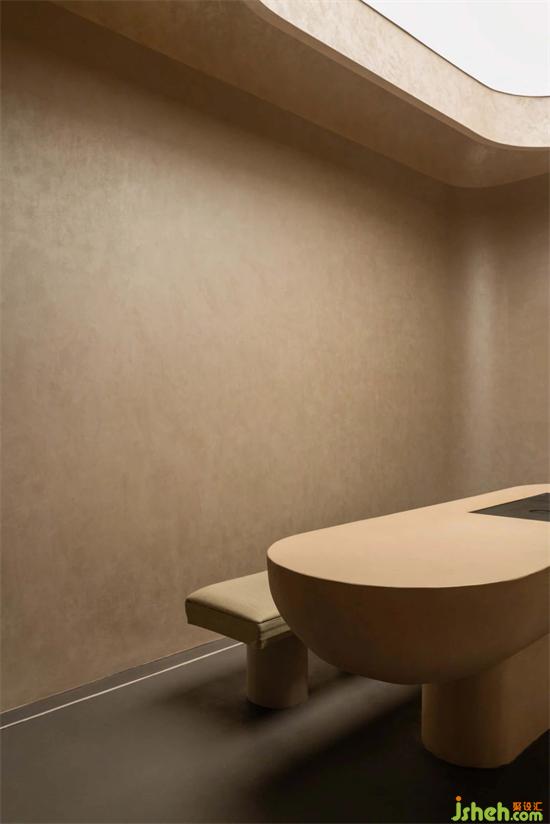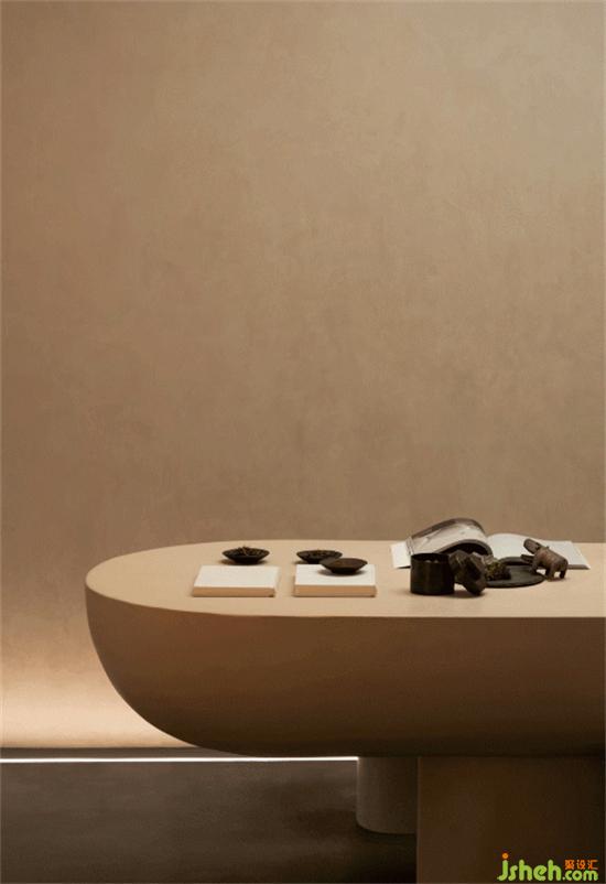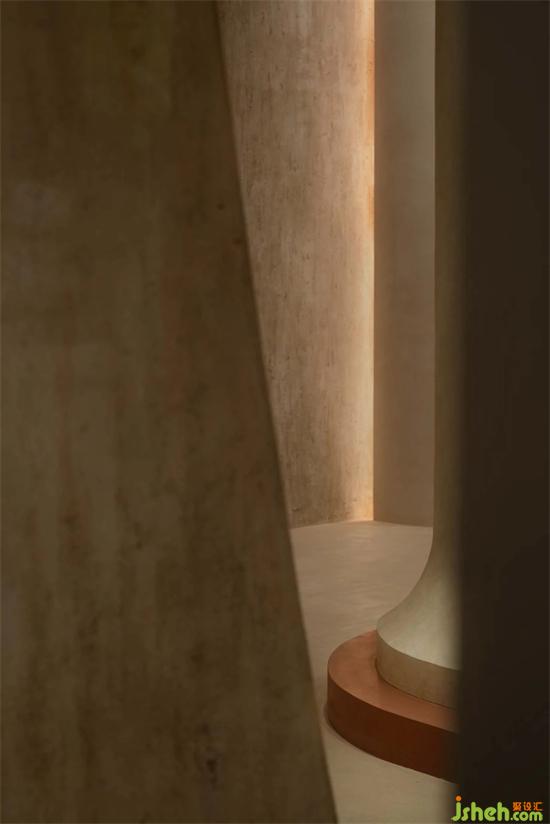 茶室前是尤勒貝特Europaint藝術(shù)涂料搭建的產(chǎn)品研發(fā)陳列區(qū),利用活石經(jīng)過(guò)高溫煅燒、分解、過(guò)濾等二十幾道工序制作而成的石灰,再進(jìn)行調(diào)和做成灰泥并與色漿碰撞,展廳設(shè)計(jì)通過(guò)精細(xì)的手法創(chuàng)作出種類繁多的藝術(shù)肌理效果,實(shí)驗(yàn)的痕跡充斥著整個(gè)空間,續(xù)寫著這里的故事。
