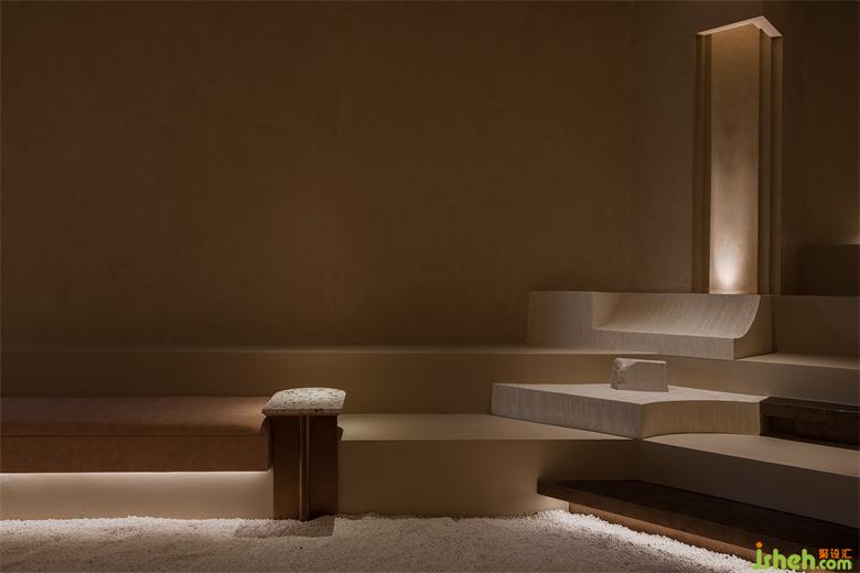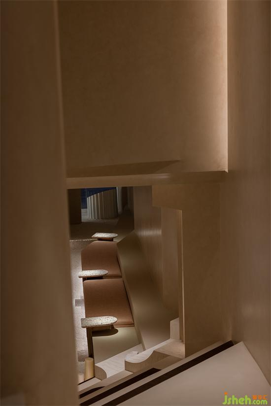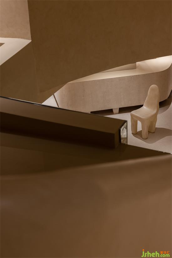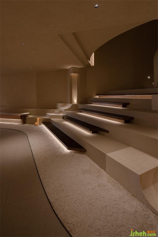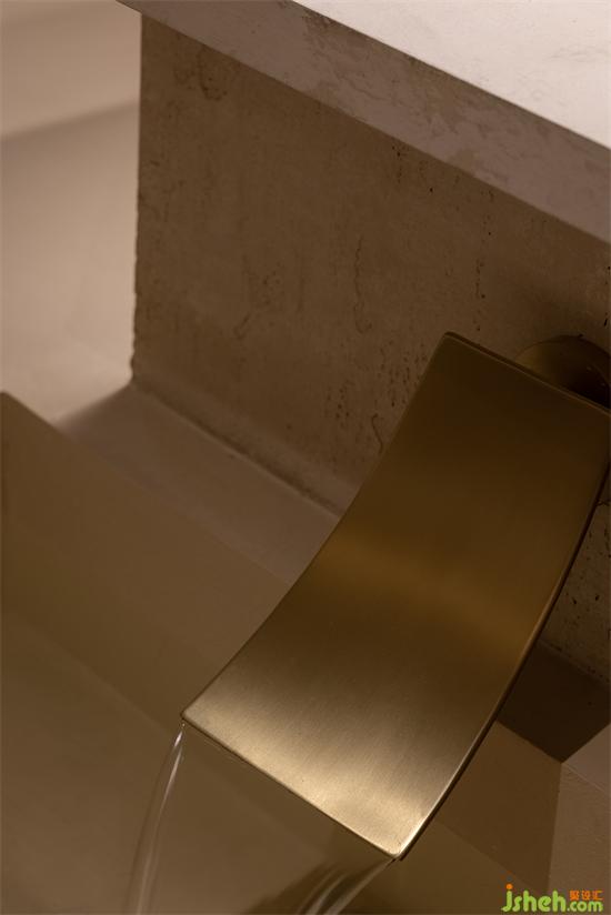 用“倫布朗光”的明暗對比方式勾勒空間形態(tài),在光影中重塑細膩、斑駁、顆粒狀與拋光材質(zhì)的沖突與交織般的戲劇效果。會所設(shè)計由微水泥與仿古銅不銹鋼拼接組成的臺階,燈帶隱藏在間隙,自下而上的燈光既在空間里描摹出多樣的層次,也能帶給拾級而下的人奇妙的秀場體驗。