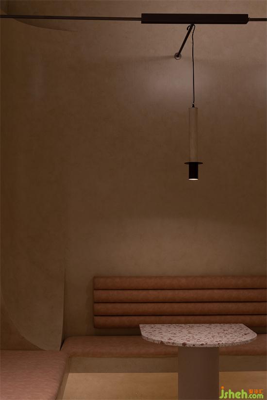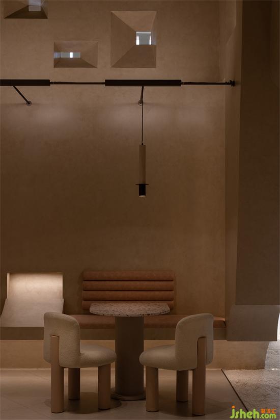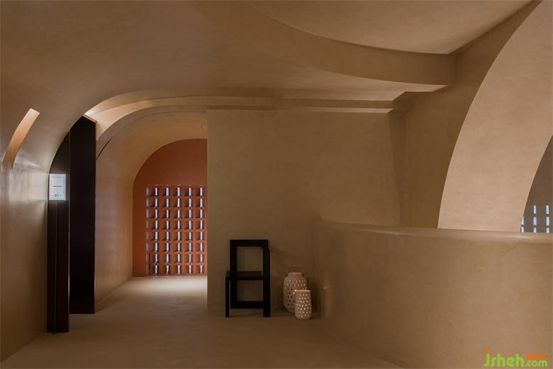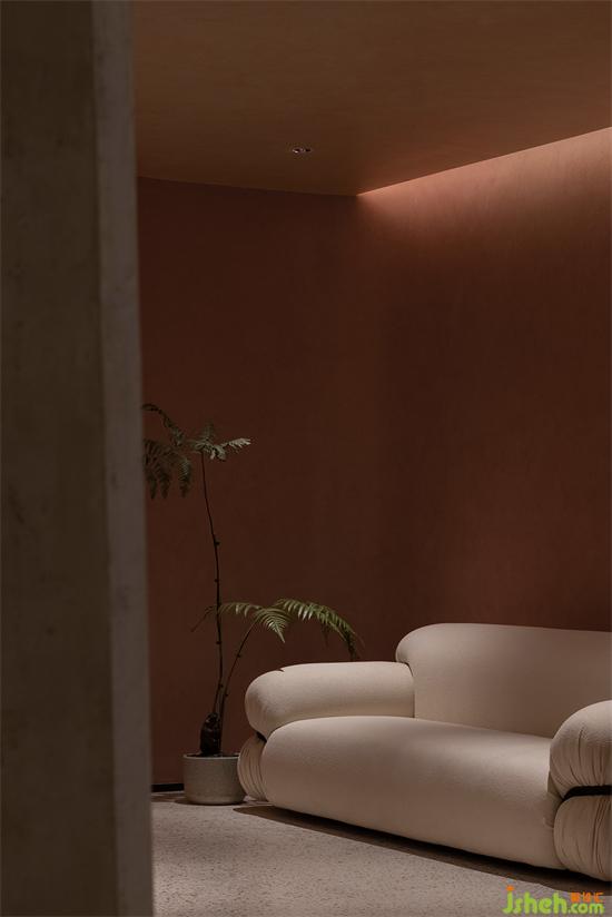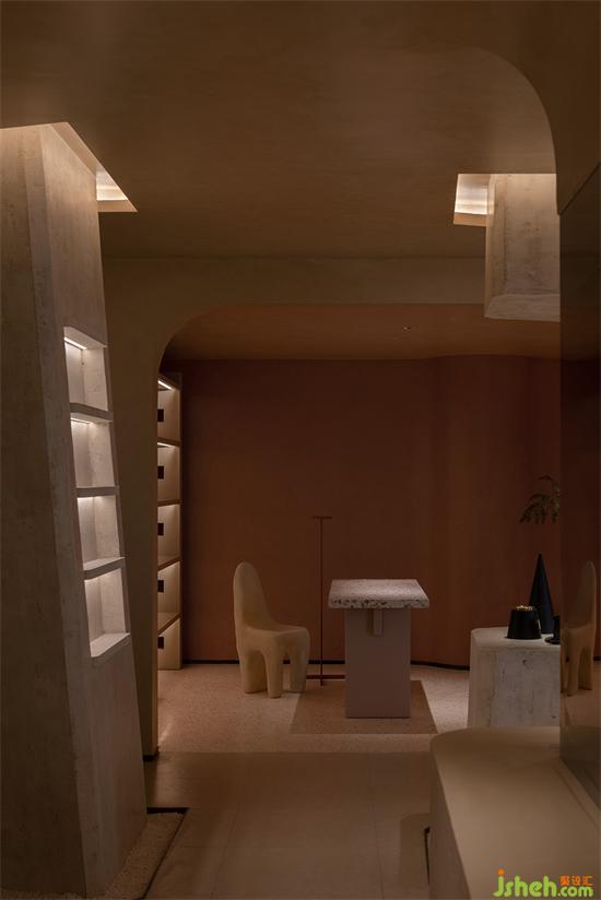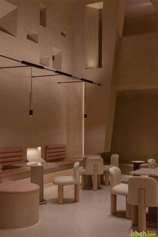 大面積沙色與淺紅砂巖色包裹整個內(nèi)建筑空間,向到訪的客人們最大限度展示“接納”的誠意。會所設(shè)計珊瑚色的坐墊,散落著粉水晶般的水磨石桌面,的好像暗藏在女性靈魂中,不會隨時間消逝的浪漫與溫柔。我們在墻壁上鑿出洞窟,將天光捕捉進室內(nèi)。也以建筑材料疊加的方式,模擬出天光乍泄的自然感官。