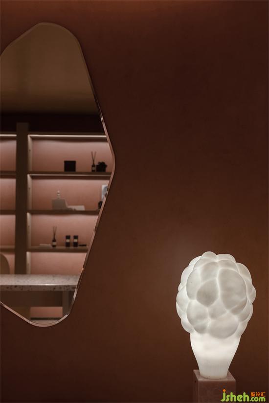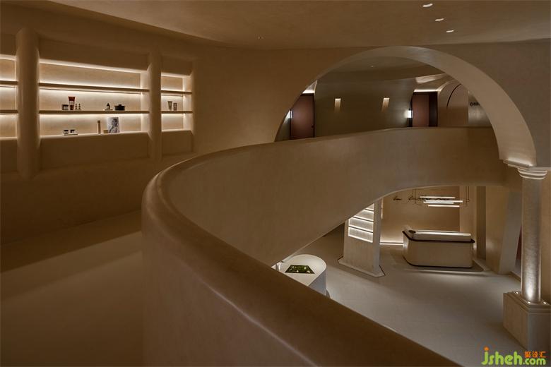 順著觸感細(xì)膩又柔軟的地毯,向上行走,去掠過外墻鏤空投進來的日光;會所設(shè)計轉(zhuǎn)交之間,去揉化掉充滿他人想象的妝容,從生活道具的角色扮演中抽離,一個個如在洞穴中鑿出的獨立美容操作空間里,即將上演關(guān)乎“美”的短劇。