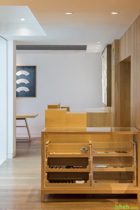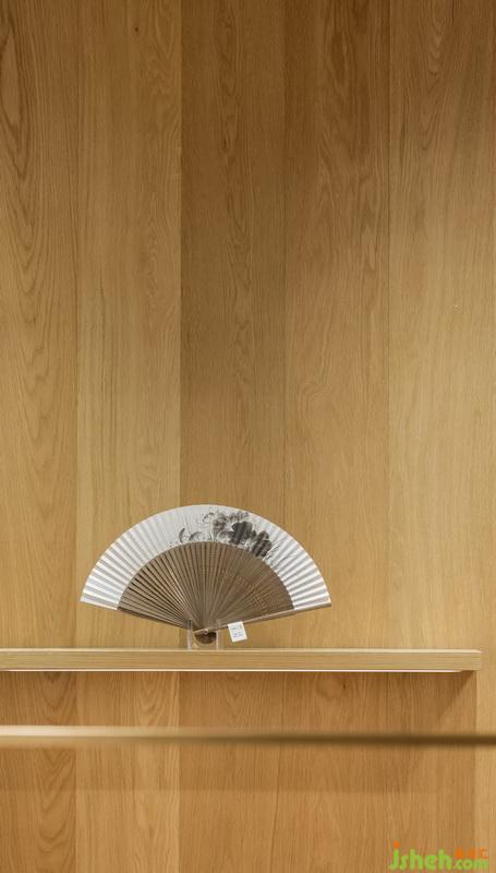 展示臺上各式不同的扇子鱗次展開,引得不少的客人在挑扇子,有人鐘情于團扇溫婉嬌俏,有人喜歡折扇雅致風流,言語之間,好不熱鬧。展示臺下的柜子比起普通的收納柜要窄上許多,正是為了扇子本身的尺度考慮。燈光透過玻璃打在最上層抽屜里的扇子上,又使得扇子更加具有質(zhì)感。