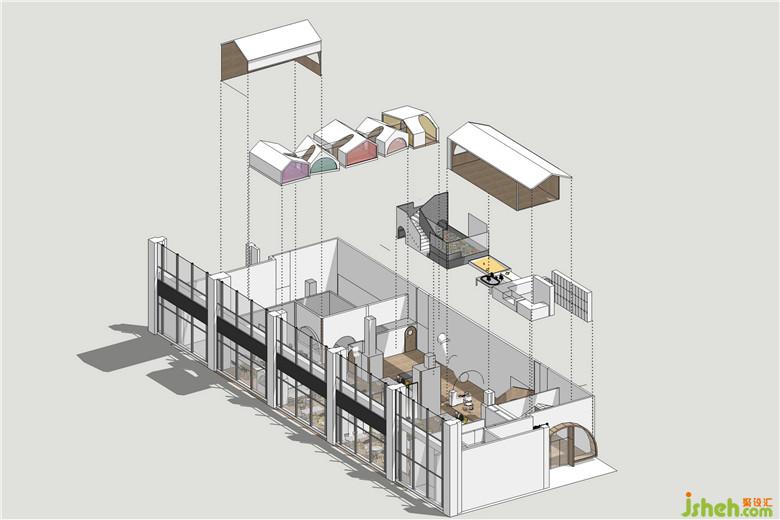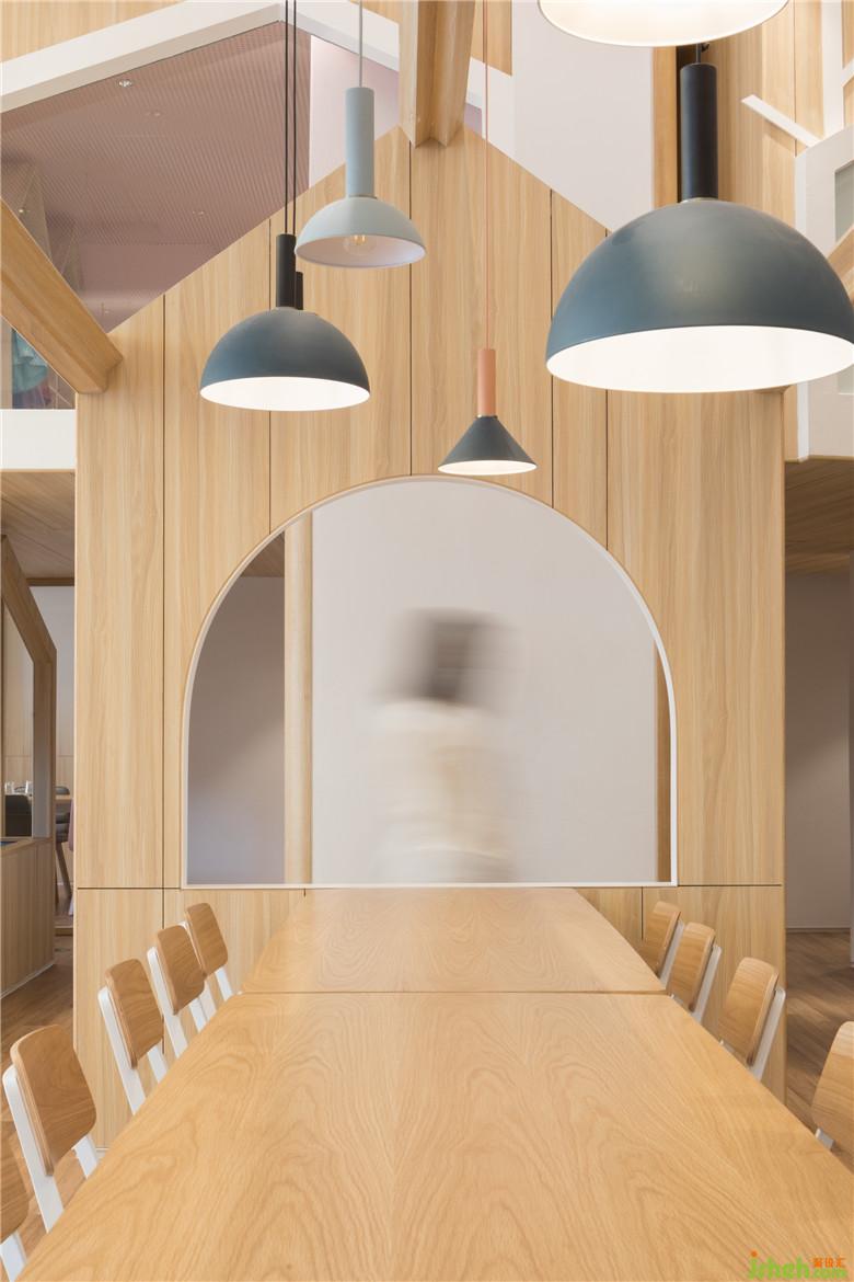 大廳的盡頭便是整個(gè)空間最最有趣的樹屋聚落。層錯(cuò)的小屋彩色的玻璃窗,玻璃的顏色不僅來(lái)區(qū)分空間又與視覺(jué)系統(tǒng)相呼應(yīng)。下層的小屋是包廂、兒童的休息室。而樓上層高不足1.5米的空間被設(shè)計(jì)成為又一不同主題的兒童體驗(yàn)空間,這個(gè)層高對(duì)于成年人而言需要彎腰才能進(jìn)入,但是對(duì)于孩子而言卻是恰恰合適而又充滿安全感。