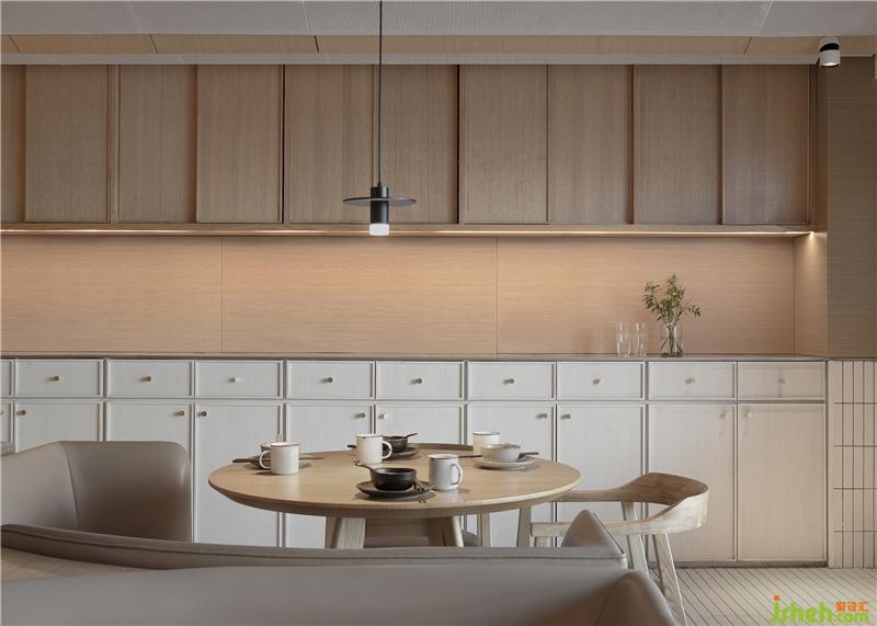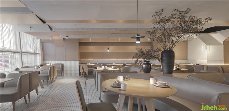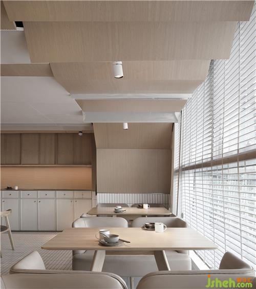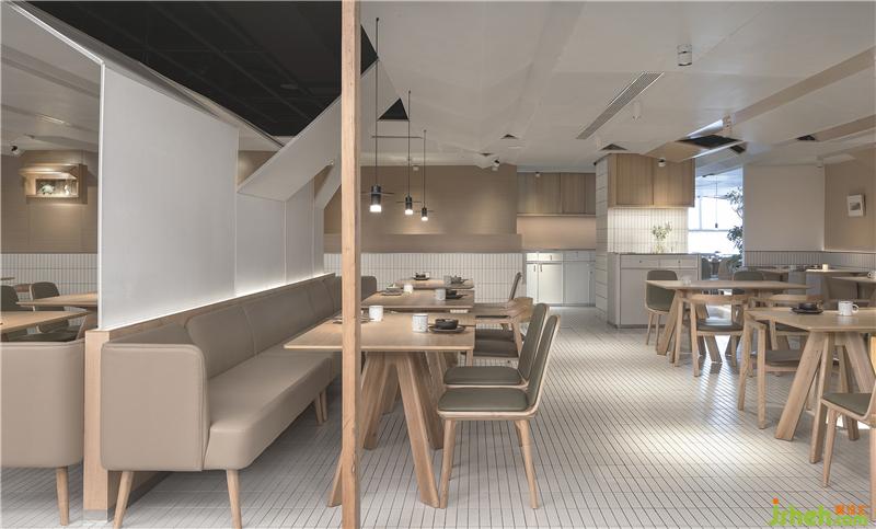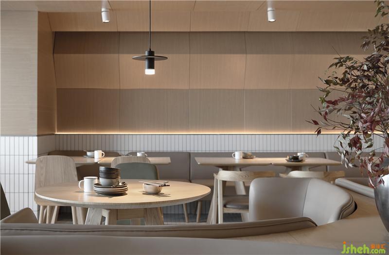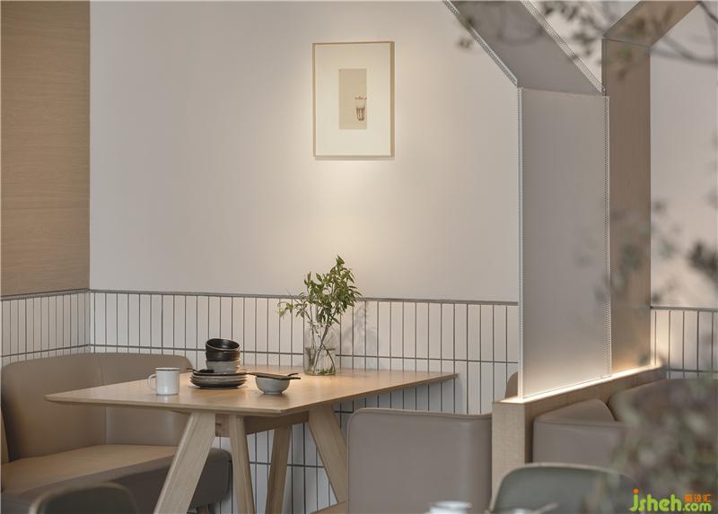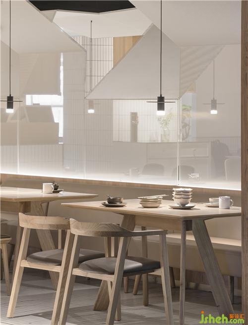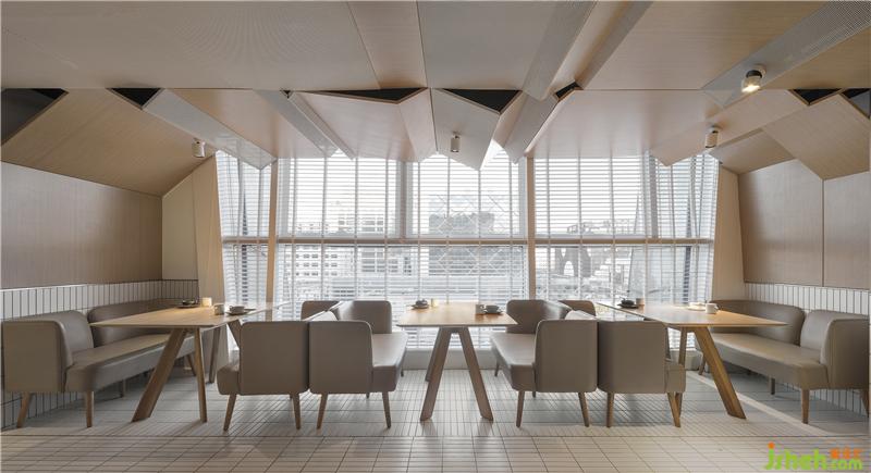 整場空間布局是矩形交錯(cuò)的場地,層高只有2500mm。如何讓低矮的空間不具壓迫感是我們這次設(shè)計(jì)的切入點(diǎn)。屋和樹是雁舍品牌設(shè)計(jì)視覺的延續(xù),是以家為核心對(duì)愛的傳達(dá)。空間中延續(xù)的屋脊是設(shè)計(jì)師對(duì)雁舍“愛”的詮釋,也是為這次設(shè)計(jì)中賦予的新的獨(dú)特觀感。高低起伏,錯(cuò)落層疊,以空間自由舒展 ,韻律的屋脊褶皺與靜謐的空間完美交融,沒有高調(diào)的設(shè)計(jì),我們想用現(xiàn)代的材料營造出"侘寂"那種簡單而返璞歸真的氛圍。餐廳設(shè)計(jì)