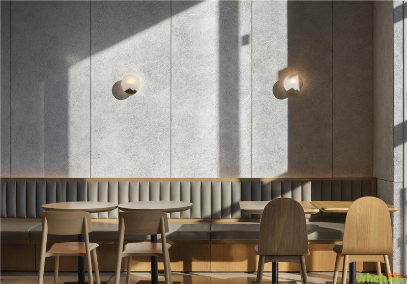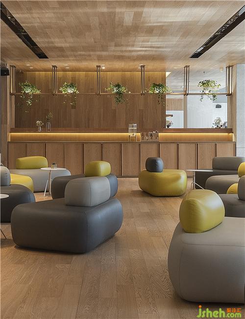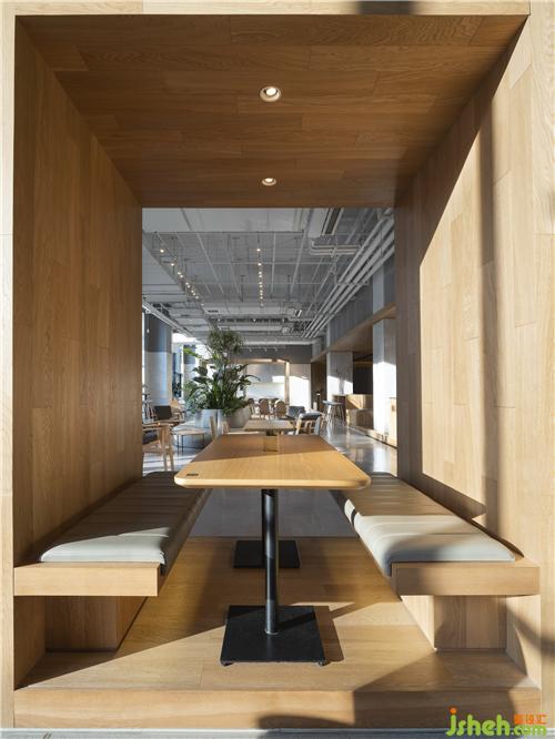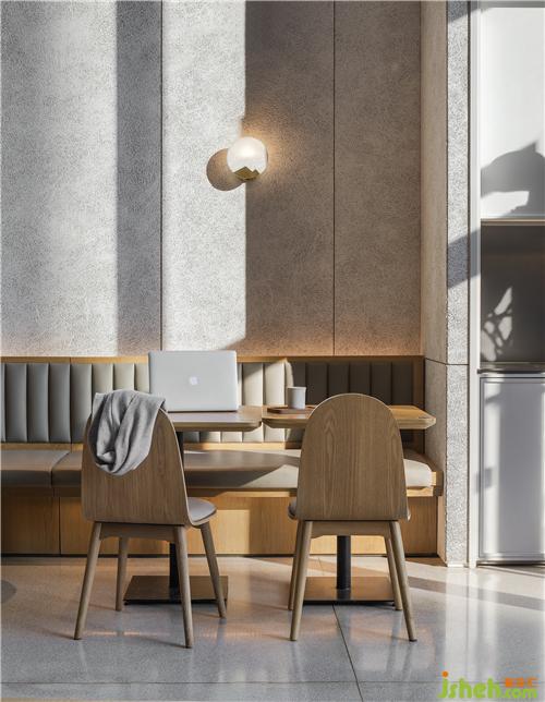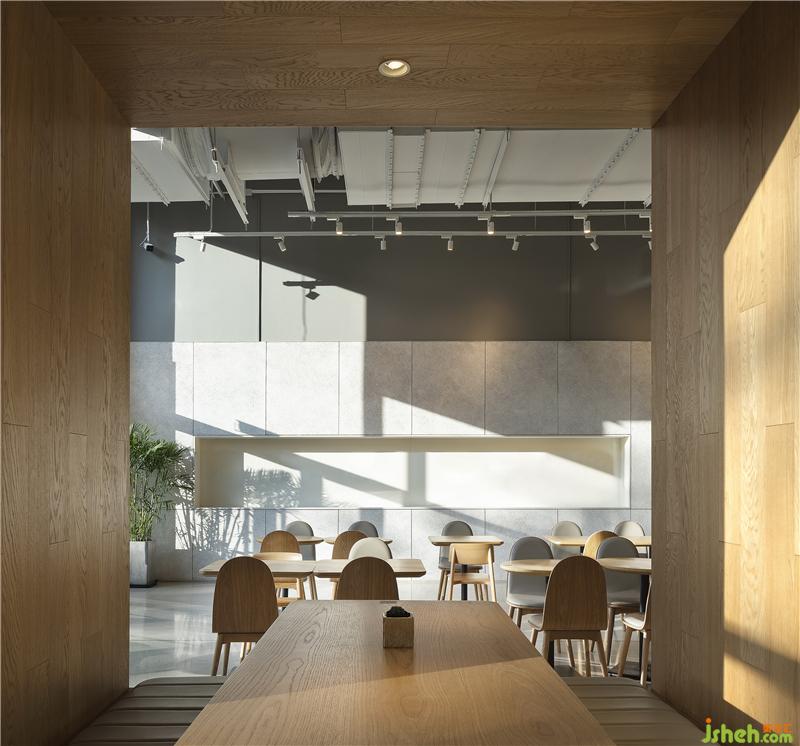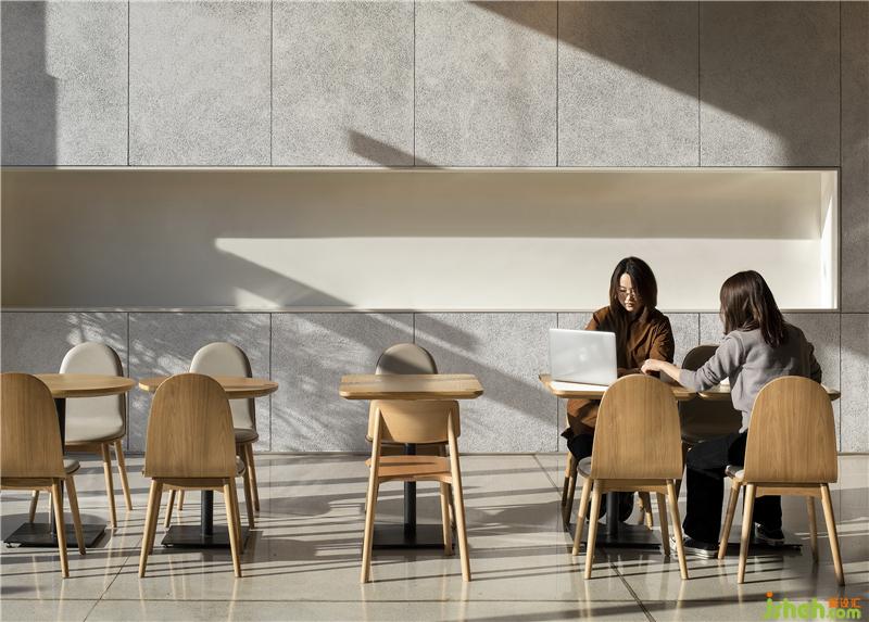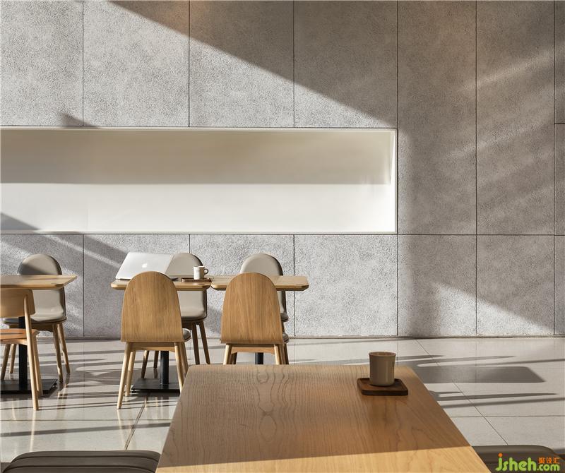 空間以白色與木色為主,自然簡(jiǎn)潔,材質(zhì)上采用橡木地板與白色木色板為主要材質(zhì),墻面上大面積使用的白色木絲板材質(zhì)有效降低與其他區(qū)域的相互干擾,實(shí)現(xiàn)完美的聲學(xué)效果??Х葟d設(shè)計(jì)