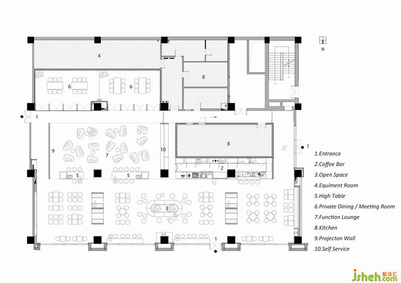 較大的多功能區(qū)與長(zhǎng)吧臺(tái)與廚房結(jié)合為一個(gè)大盒子,為整個(gè)空間的主體,剩下的空間為座位區(qū),布局較為對(duì)稱。分別為一人位,兩人位,三人位,四人位,VIP。2個(gè)小木盒子卡座將散座區(qū)分為3個(gè)區(qū)域,中心為休閑沙發(fā)區(qū)。