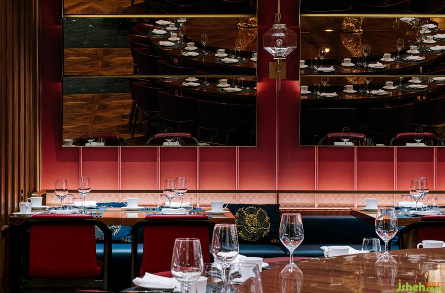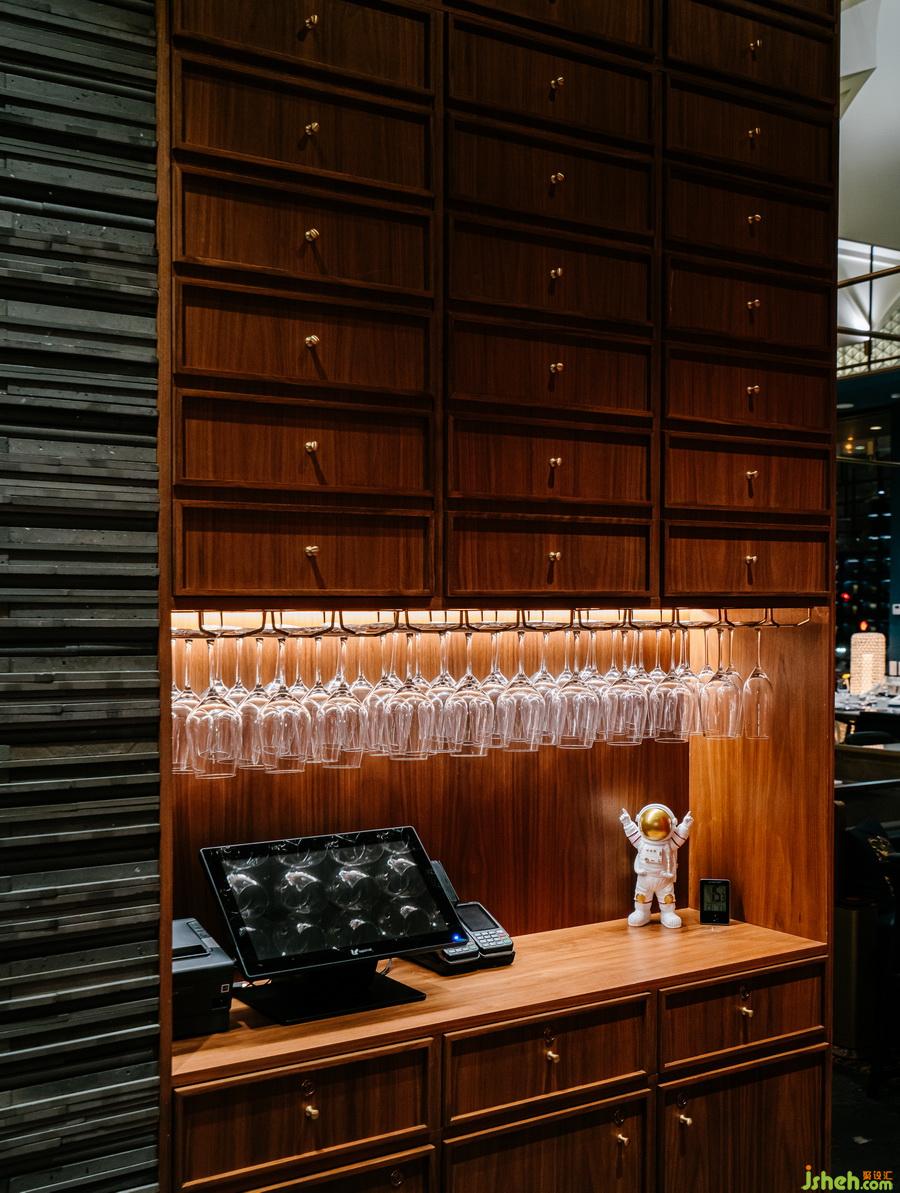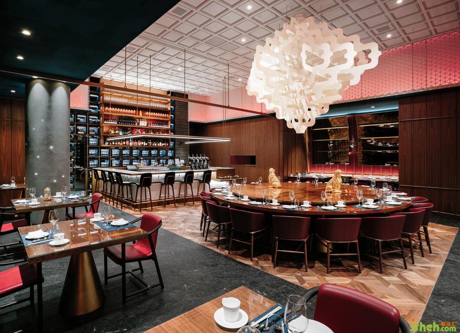 酒吧區(qū)的天花用的是鋁板制作的現(xiàn)代版本中式斗拱,是造型,也是種文化的表現(xiàn),斗拱既是承重構(gòu)件,又是藝術(shù)構(gòu)件,利用復(fù)雜的采用榫卯結(jié)合將屋頂?shù)闹亓拷?jīng)由梁架、立柱傳遞至基礎(chǔ)。遇有強(qiáng)烈地震時(shí),斗拱結(jié)構(gòu)雖會(huì)“松動(dòng)”卻不致“散架”,消耗地震傳來(lái)的能量。斗拱柔中帶剛,借力使力有如太極,斗栱雖然堅(jiān)固但所有的榫卯零件卻一個(gè)都不能少,少了任何一個(gè)小零件就會(huì)散架。酒吧頂端環(huán)繞古建筑斗拱,既是結(jié)構(gòu)也是美好的中華藝術(shù)的表現(xiàn)。設(shè)計(jì)師將斗拱利用3D拼圖的方式表現(xiàn),沉重的斗拱轉(zhuǎn)化為輕盈的文化裝置藝術(shù)品。The ceiling of the bar area is a modern version of Chinese-style bucket arch made of aluminum plate. The bucket arch is both a load-bearing component and an art component. The complex use of tenon and mortise is used to combine the weight of the roof through beams and columns. In the event of a strong earthquake, the bucket arch structure will "loosen" but not "fall apart", consuming energy from the earthquake. The Dougong is soft and rigid, and it is like Tai Chi by force. Although the Dougong is strong, all the tenon and mortise parts are one, and any small parts will fall apart. The top of the bar is surrounded by ancient arches, which is a structure and a beautiful expression of Chinese art. The designer uses the way of 3D puzzle to express the bucket arch, transforming the heavy bucket arch into light cultural installation artwork.餐廳設(shè)計(jì)