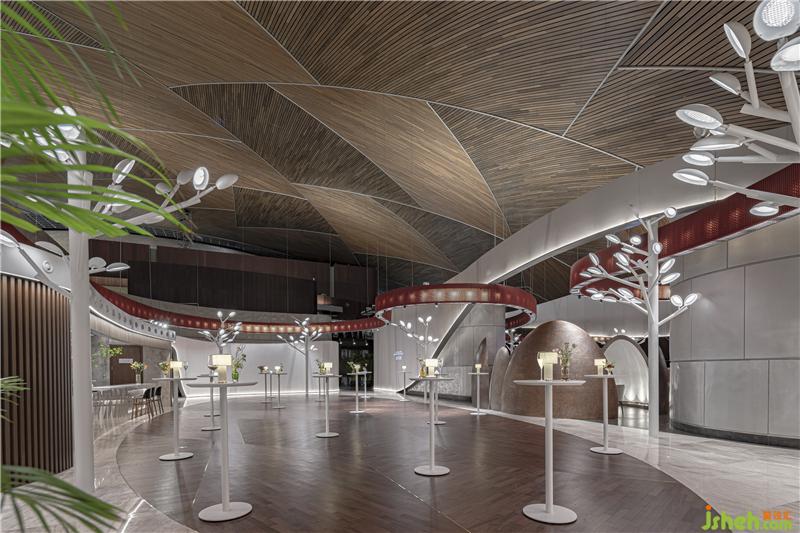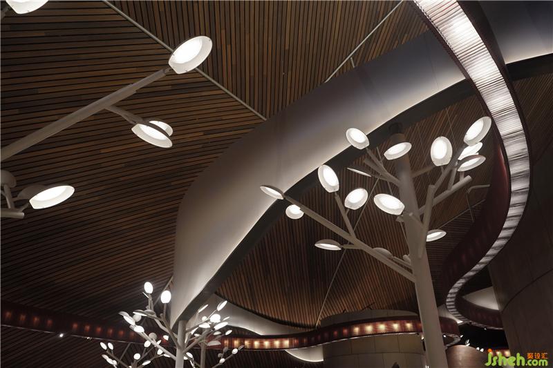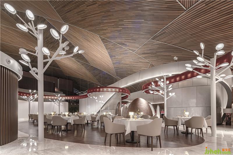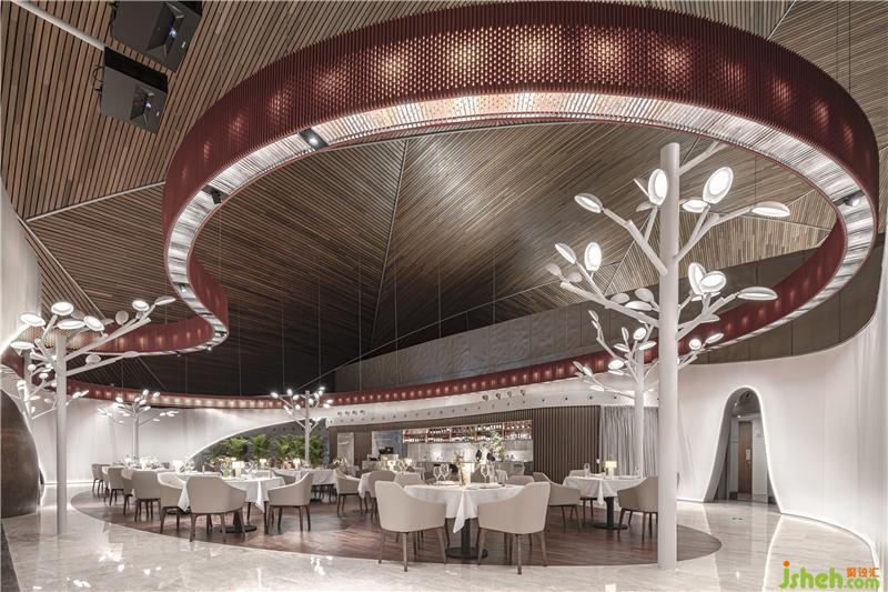 餐廳的照明則采用了樹(shù)的形態(tài),樹(shù)象征著生命力,樹(shù)燈無(wú)序地穿插在餐廳各處,解決了無(wú)吊頂?shù)恼彰鲉?wèn)題的同時(shí),也給空間注入了新生的寓意。配合飄帶立面造型,營(yíng)造了藝術(shù)叢林的空間氛圍。