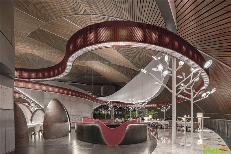 曲線的飄帶更像是個(gè)裝置藝術(shù)品,不僅和建筑曲面拱頂形成呼應(yīng),也和北京餐廳設(shè)計(jì)建筑原有的龍燈融為一體,既能起到空間分隔功能的作用,又能豐富室內(nèi)空間的層次。