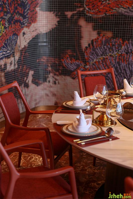 餐飲設(shè)計(jì)根據(jù)空間現(xiàn)有的紅金基調(diào),加入灰白色調(diào)令空間增加明快輕盈感,并突出主體物的鮮明配色。