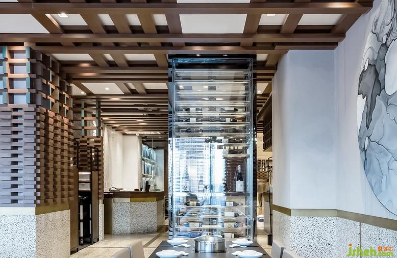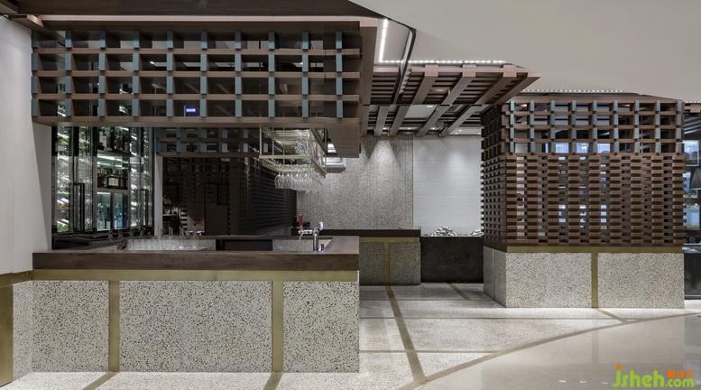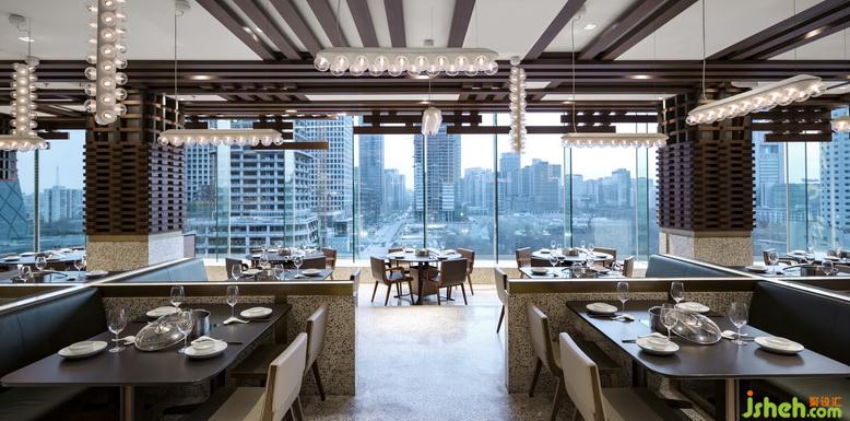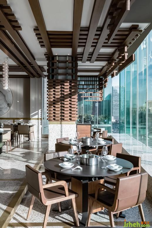 在設(shè)計(jì)之初我們就確定了以玻璃幕景觀區(qū)域?yàn)樵O(shè)計(jì)的切入點(diǎn),利用原有的下沉空間把餐廳設(shè)計(jì)成一個(gè)微縮小劇場,以玻璃幕區(qū)域?yàn)樽畹忘c(diǎn)向內(nèi)部空間依次抬高,并形成三個(gè)劇場式臺(tái)階,那么在不同高度上就餐的人們就能更好的欣賞到三環(huán)美景,其他的剩余空間較為私密正好作為包間使用同時(shí)也提高了零散空間的使用效率。在材料使用方面主要運(yùn)用了原木為主的自然材質(zhì),并利用最為原始的搭建手法制造出豐富的空間效果。